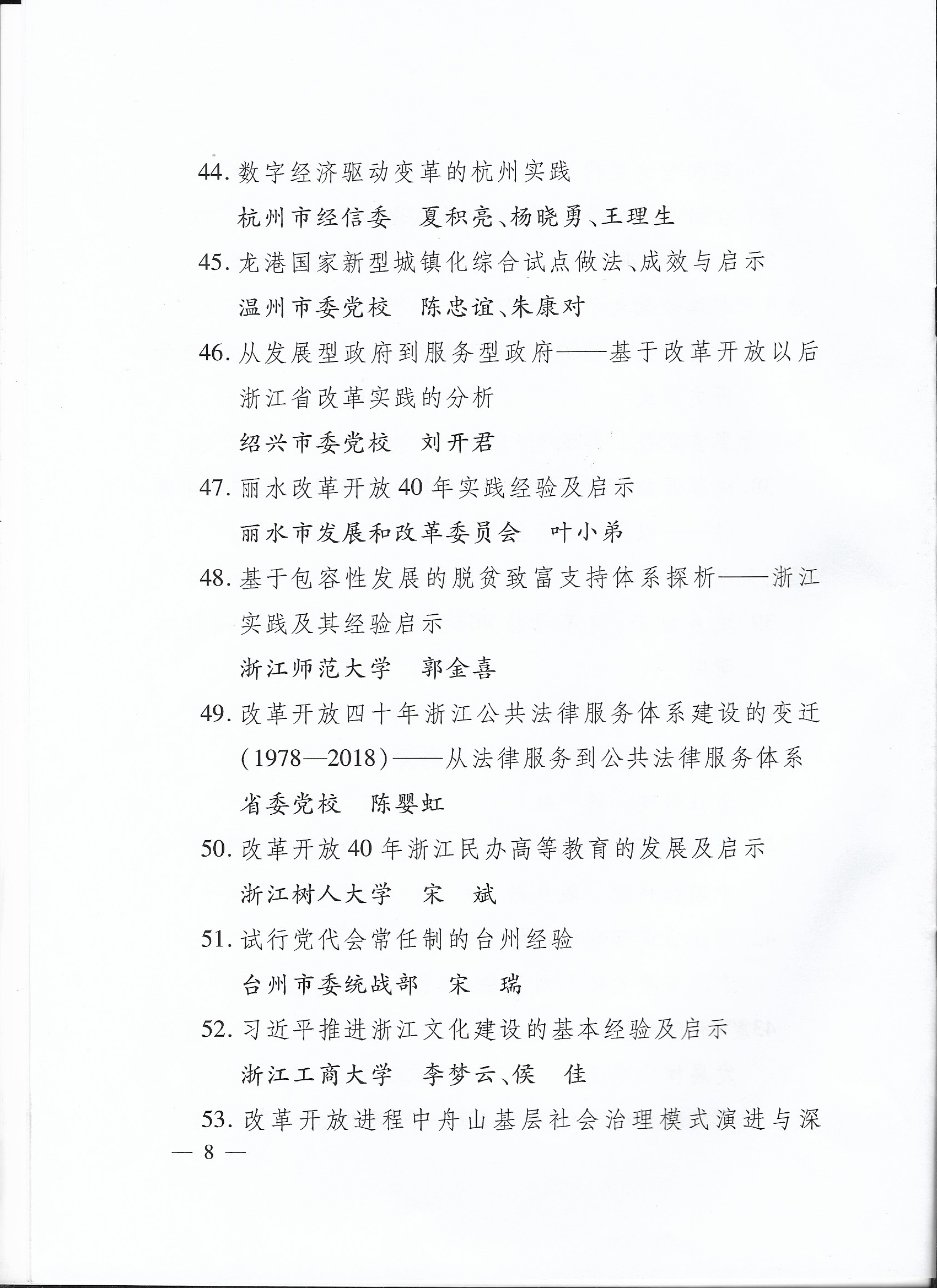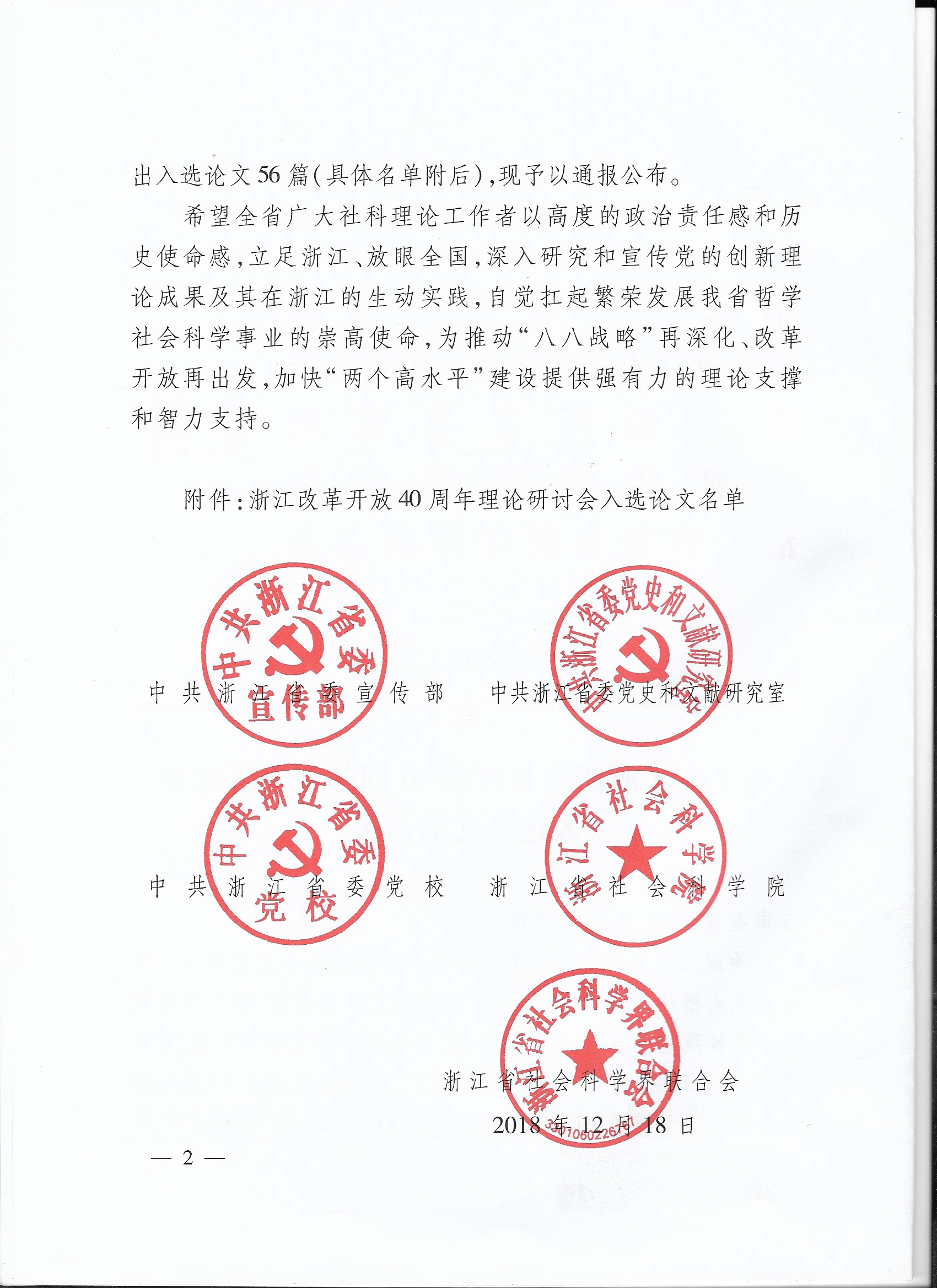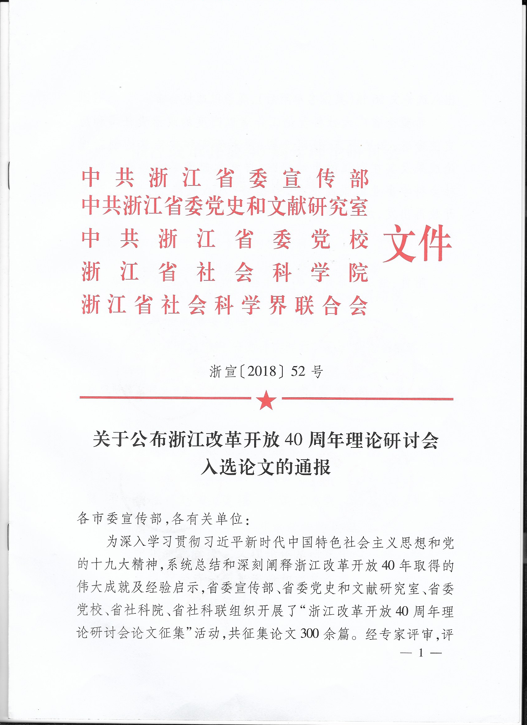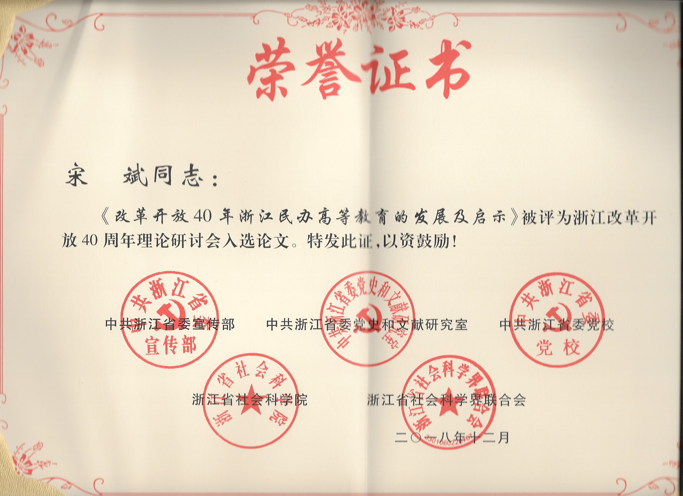12月28日, 由省委宣传部、省委党史和文献研究室、省委党校、省社科院、省社科联联合主办的浙江改革开放40周年理论研讨会在杭举行。会上宣读了浙江改革开放40周年理论征文入选论文的通报文件,浙江树人大学(浙江树人学院)党委宣传部选送的宋斌教授论文《改革开放40年浙江民办高等教育的发展及启示》入选。据悉,本次论共征集300余篇,最终评审出56篇入选,其中高校11篇。
