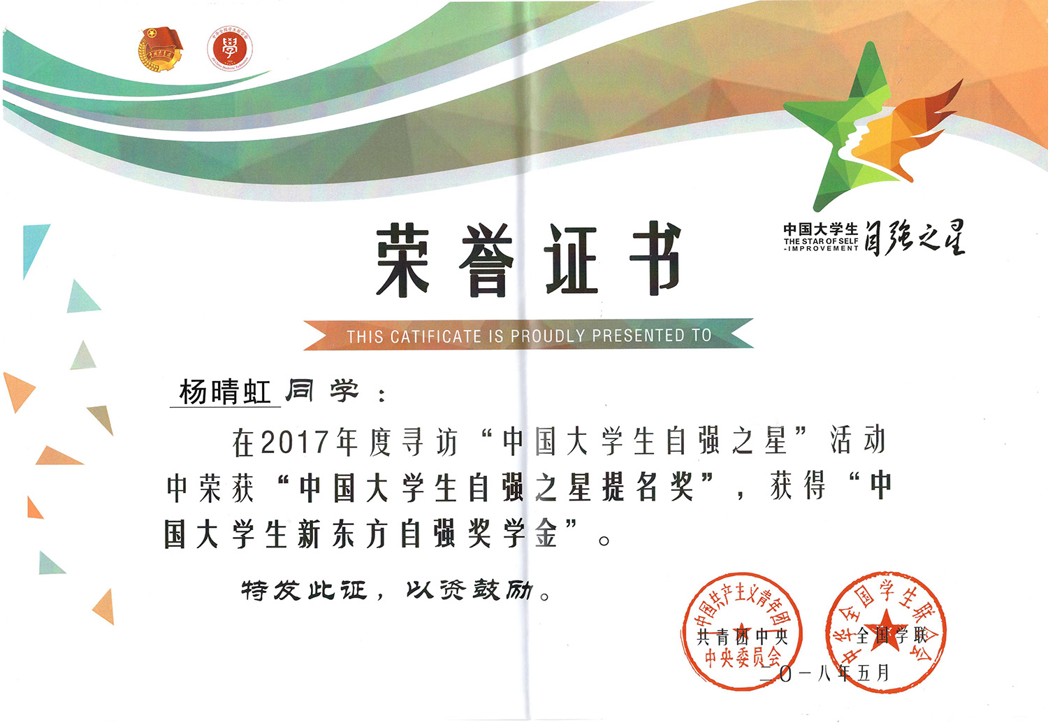 日前,由共青团中央、全国学联共同主办2017年度寻访“中国大学生自强之星”活动评比结果揭晓,浙江树人大学人文与外国语学院杨晴虹同学获评2017年度“中国大学生自强之星”提名奖,并获得由新东方教育科技集团提供的“中国大学生新东方自强奖学金”。