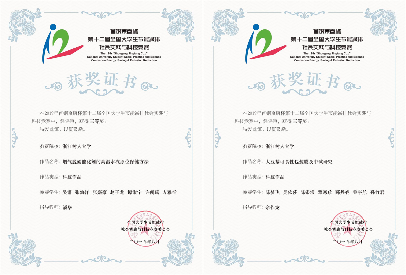 2019年8月8日—10日,由教育部高等教育司主办、华北理工大学承办的“首钢京唐杯”第十二届全国大学生节能减排社会实践与科技竞赛落下帷幕。浙江树人大学生物与环境工程学院2支参赛队伍喜获三等奖2项。