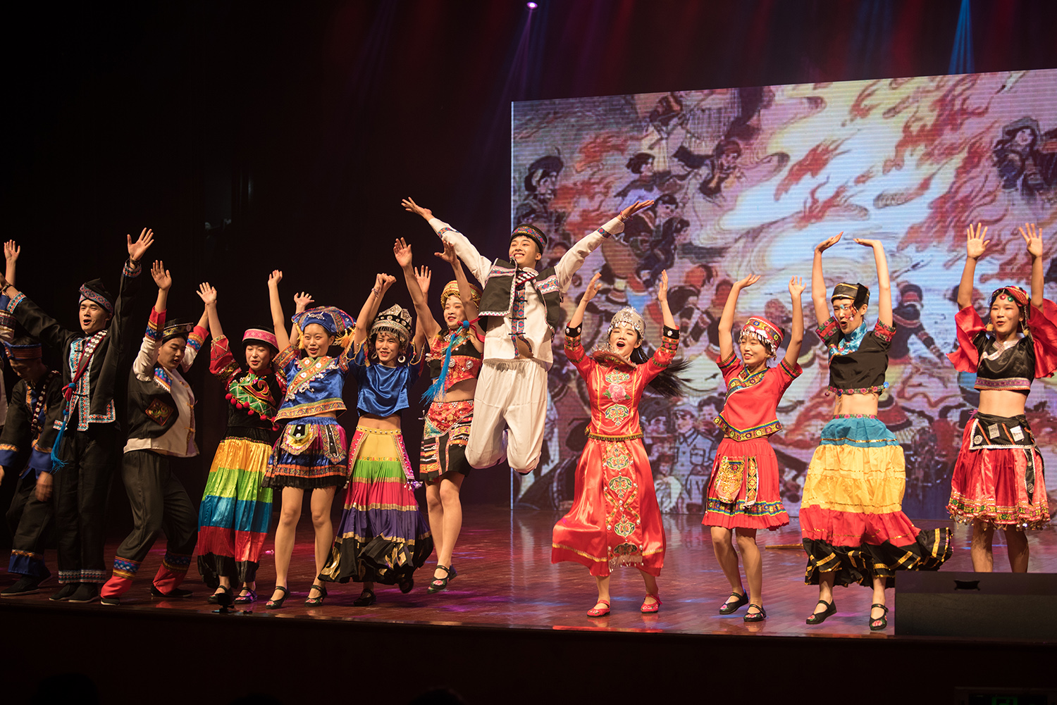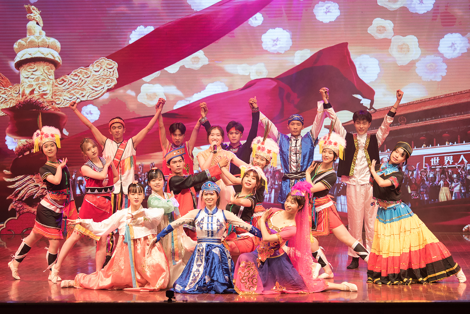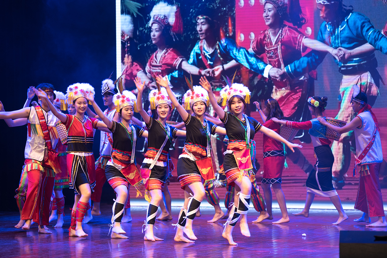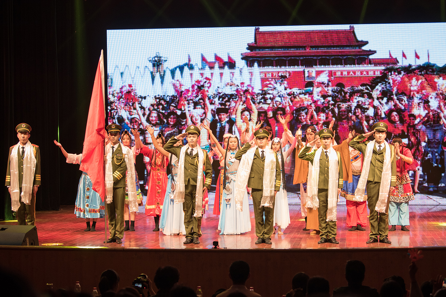 基础学院展示了高山族的人文风貌,他们欢度背篓节,用独特的舞蹈迎接捕鱼归来的亲人;城建学院展示的壮族古老而神秘,壮族小伙的壮拳刚劲有力,壮族姑娘能歌善舞,抛绣球这古老而传统的方式体现了丰富多彩的民族文化;人外学院向我们展示的则是大方热情的蒙古族,院党委书记何纪敏更是化身游客参加了热闹的那达慕大会,他们载歌载舞,别具特色的婚礼给我们留下了深刻印象;信息学院带来的佤族则是云南省独有的民族,“无酒不成礼”是他们的信仰,新火节预示着新的一年吉祥安康,表达了佤族人民对于美好幸福生活的向往继教学院为我们带来的满族文化,生动再现了清朝各个等级的服饰和礼仪;建管学院带来的彝族文化,火把节人们齐聚载歌载舞,笑语欢声犹如火把般雀跃欢呼;现服学院更是展示了中国唯一一个海洋民族——京族,他们靠海而生,崇尚大海;朝鲜族,也称中国朝鲜族,朴素的白衣民族,他们鞠躬握手,注重家族礼仪,尊重老人;艺术学院的维吾尔族,为我们展现了一个完整的婚嫁过程,服饰精美,仪式多样;生环学院苗族的雍容华贵服饰充分展现了民族特色;管理学院的藏族,是最古老的民族之一,脱帽礼、敬茶礼、献哈达礼都反映他们对礼仪的重视,在参赛代表们展示完别具特色的藏族文化和风情之后,舞台上出现了身穿中国军装、肩抗五星红旗的驻藏军人们。今年是新中国成立70周年,驻藏的军人们以他们不畏艰险、甘于奉献的精神为祖国母亲送上一份最真诚的礼物。