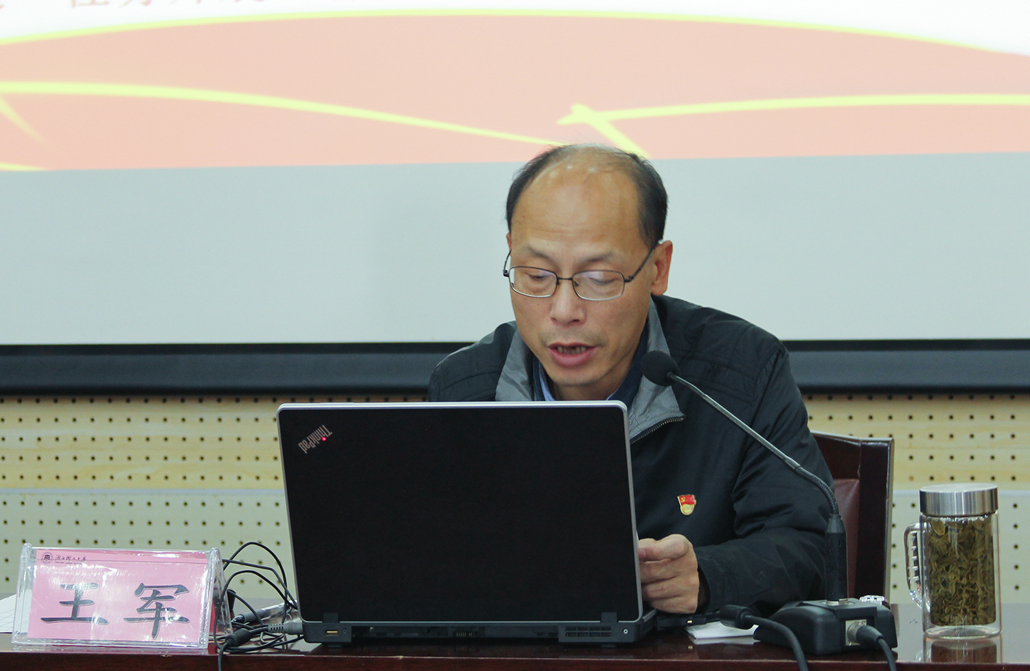 王军以《践行教育初心,担当育人使命,服务学生成才成长》为主题,围绕主题教育的总要求、总步骤、总目标,以及学校关于主题教育活动的总体部署,从四个层面全面、具体、深入的阐述了中国共产党的初心和使命、教育的初心和使命、学校的初心和使命以及学生思政教师的初心和使命,并着重围绕如何守护初心,担当使命谈了四个方面的认识。