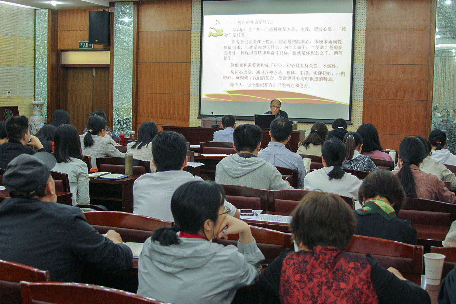 10月21日下午,校党委副书记王军应邀作为第37期学生思政工作论坛的主讲嘉宾,为全体学生思政教师上了一堂精彩的“不忘初心、牢记使命”主题教育专题党课。学生发展与服务处全体人员以及各学院学生思政教师参加了本次论坛,杨汛桥校区思政线同志同步收看了论坛直播。