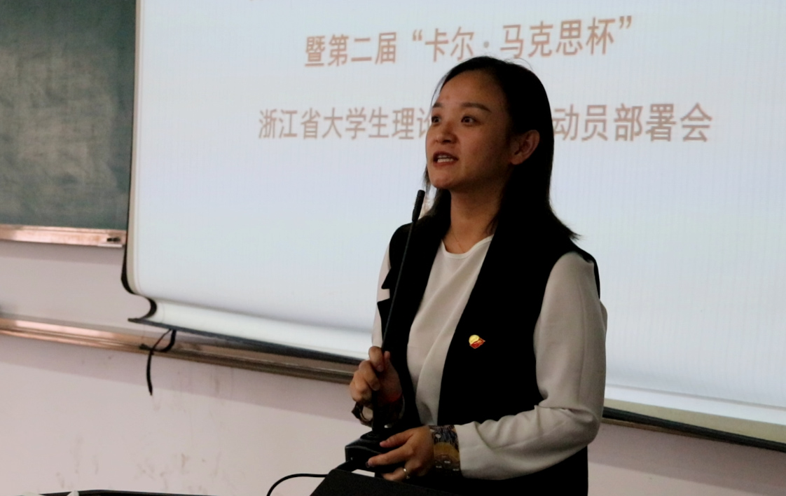 潮平海天阔,扬帆正当时。为深入贯彻党的十九大会议精神,践行“不忘初心 牢记使命”主题教育实践活动,推进习近平新时代中国特色社会主义思想进教材、进课堂、进学生头脑,激发大学生对思想政治理论的学习热情和兴趣,引导大学生紧跟时代步伐,把握世情、国情、省情,增强中国特色社会主义的道路自信、理论自信、制度自信和文化自信,提高大学生思想政治素质和运用马克思主义理论观察问题、分析问题和解决问题的能力, 10月24日中午,城建学院在B1-103阶梯教室,举办首届“卡尔•马克思杯”班级擂台挑战赛暨第二届“卡尔•马克思杯”浙江省大学生理论知识竞赛动员部署会。学院党委副书记翁就勇、马克思主义学院副院长张玲,王雪博士出席,城建学院2017级全体学生到会参加。动员会由学院学工主管阮汝泓主持。
