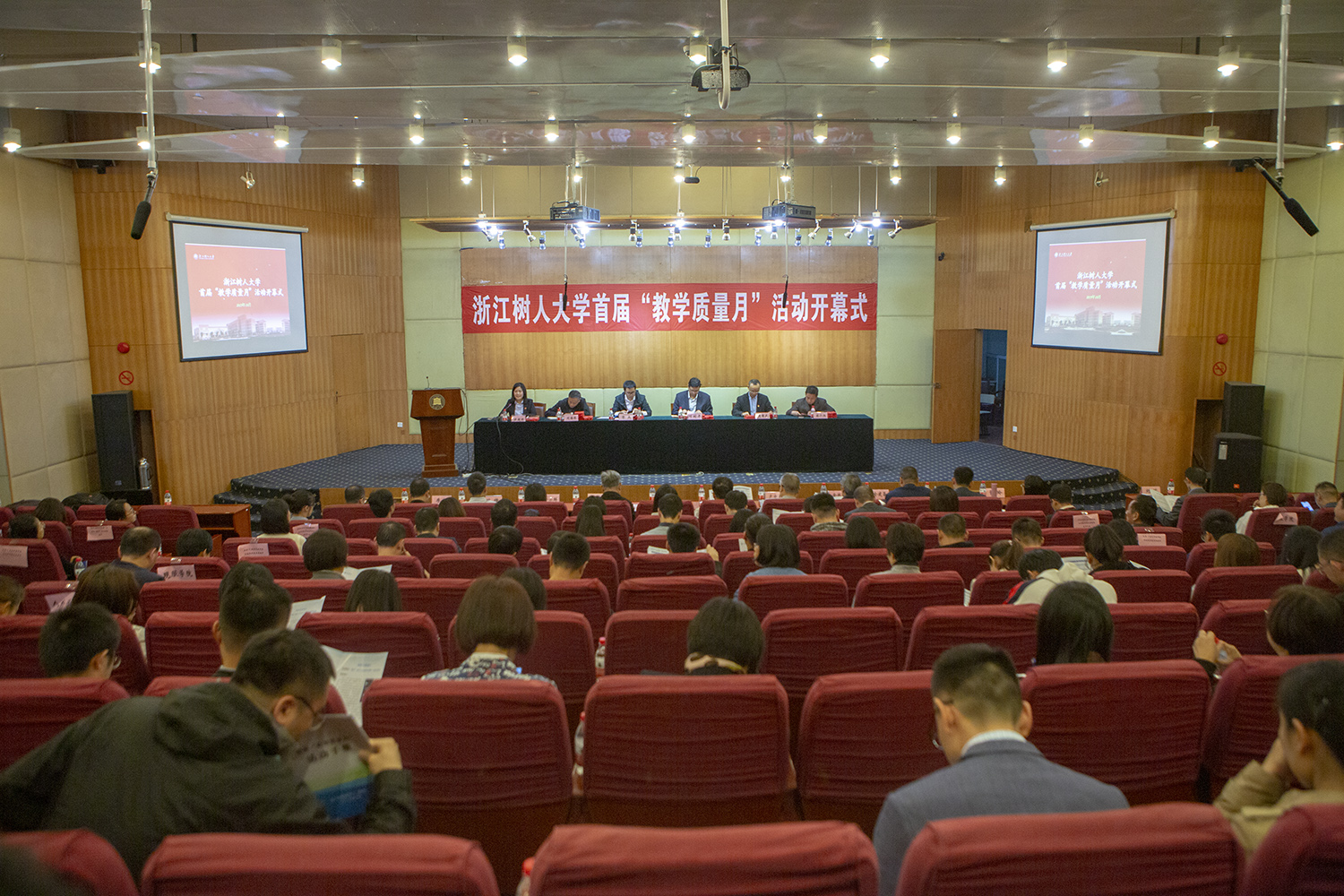 为了深入贯彻全国教育大会和新时代全国高等学校本科教育工作会议精神,进一步强化教学质量意识,10月29日下午,学校在学术报告厅举行了我校首届“教学质量月”活动开幕式。叶时平副校长出席,部分学院院长、各教学单位教学副院长、相关处室领导、学院骨干教师代表、2018-2019学年课堂教学质量评价优秀的教师代表、2018-2019-2学期“互联网+教学”示范课堂教师、校第11届青年教师教学技能竞赛获奖教师、校第12期教师教学发展研修班教师和全体工作人员等200余人参加了此次活动。活动由教学质量监控(教师教学发展)中心陈超祥主任主持。