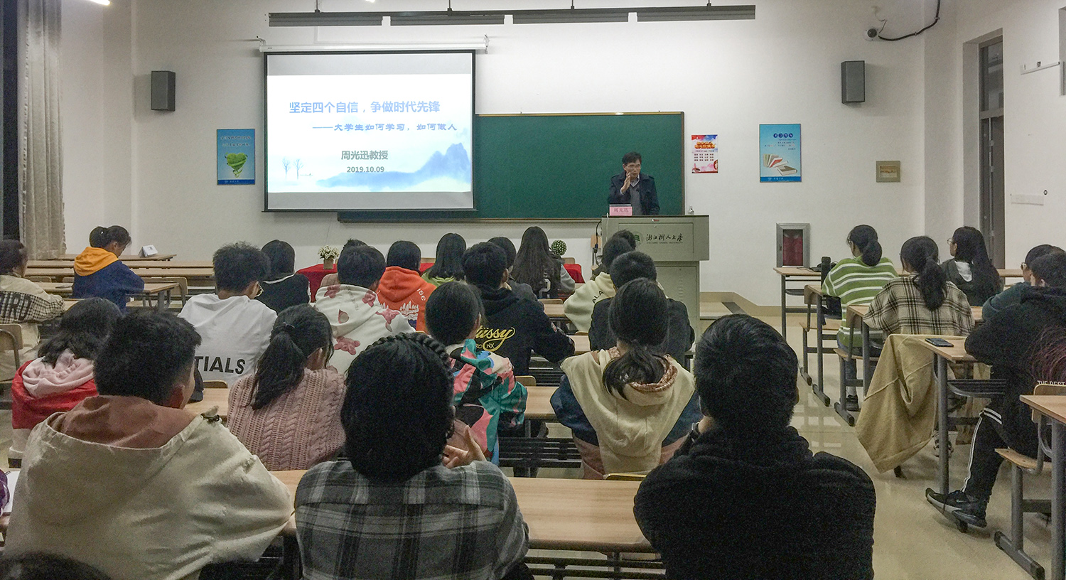 习近平总书记在全国高校思想政治工作会议指出,要把立德树人作为中心环节,把思想政治工作贯穿教育教学的全过程,实现全程育人、全方位育人。家扬书院一直以来,高度重视学生的思想政治教育工作。根据家扬书院“不忘初心、牢记使命”主题教育活动相关安排,10月29日晚,我校马克思主义学院院长周光迅教授应邀来到家扬书院“三余讲坛”,为书院19级学生作了一场以“坚定四个自信,争做时代先锋——大学生该如何学习,如何做人”为主题的讲座。讲座由刘斌副院长主持。