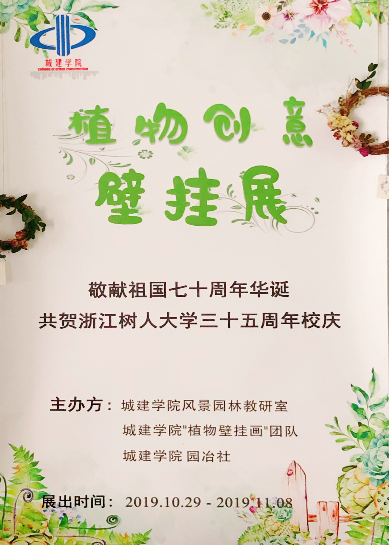 今年是新中国建国七十周年,也是我校成立三十五周年,为了向祖国和母校献上最诚挚的祝福,展现出城建学院教职工及学生的爱国爱校情怀,10月29日至11月8日,城建学院在学院一楼大厅举办“植物创意壁挂展”。本次活动中的植物壁挂主要由风景园林专业新苗项目“壁挂植物画设计应用”团队及园冶社成员制作完成。通过举办这次主题植物壁挂展,意在通过一幅幅色彩明快、绿色环保、充满正能量的植物壁挂作品,为学生们提供交流学习的平台,鼓励学生们在专业道路上的大胆探索。同时引导我校学生树立健康乐观、积极向上的人生观、价值观。