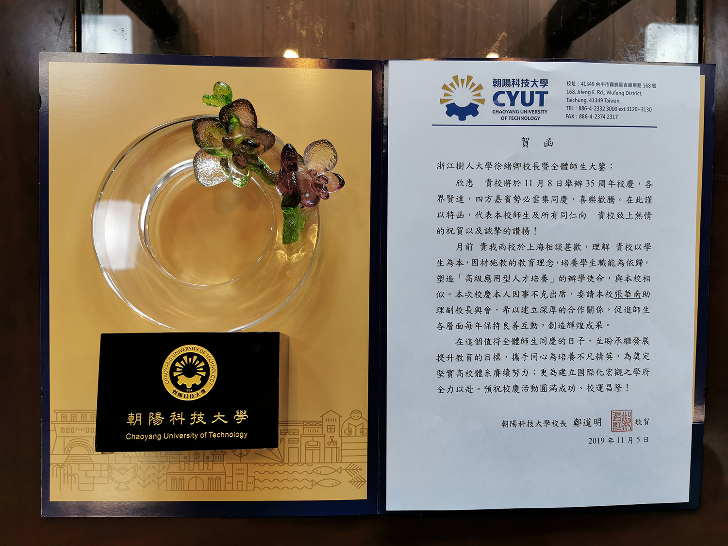 接着,徐校长接见了台湾朝阳科技大学助理副校长张华南。张副校长代表校长郑道明向我校建校35周年表示热烈祝贺,并向徐校长递呈贺函。贺函写道,在这个值得全体师生同庆的日子,至盼承继发展提升教育的目标,携手同心为培养不凡精英,为奠定坚实高校体系继续努力,更为建立国际化宏观之学府全力以赴。徐校长对张副校长首次到访学校表示热烈的欢迎和感谢。他认为,朝阳科技大学应用型人才培养的办学定位与我校高级应用型人才培养的目标有共通之处,希望两校在人才培养、科研合作、师资水平提升等方面开展交流与合作,共同提高办学能力和水平。徐校长还代表学校与朝阳科技大学签订了合作备忘录,两校约定共同开展学术交流、合作研究、师资培养、学生互派等领域的合作。