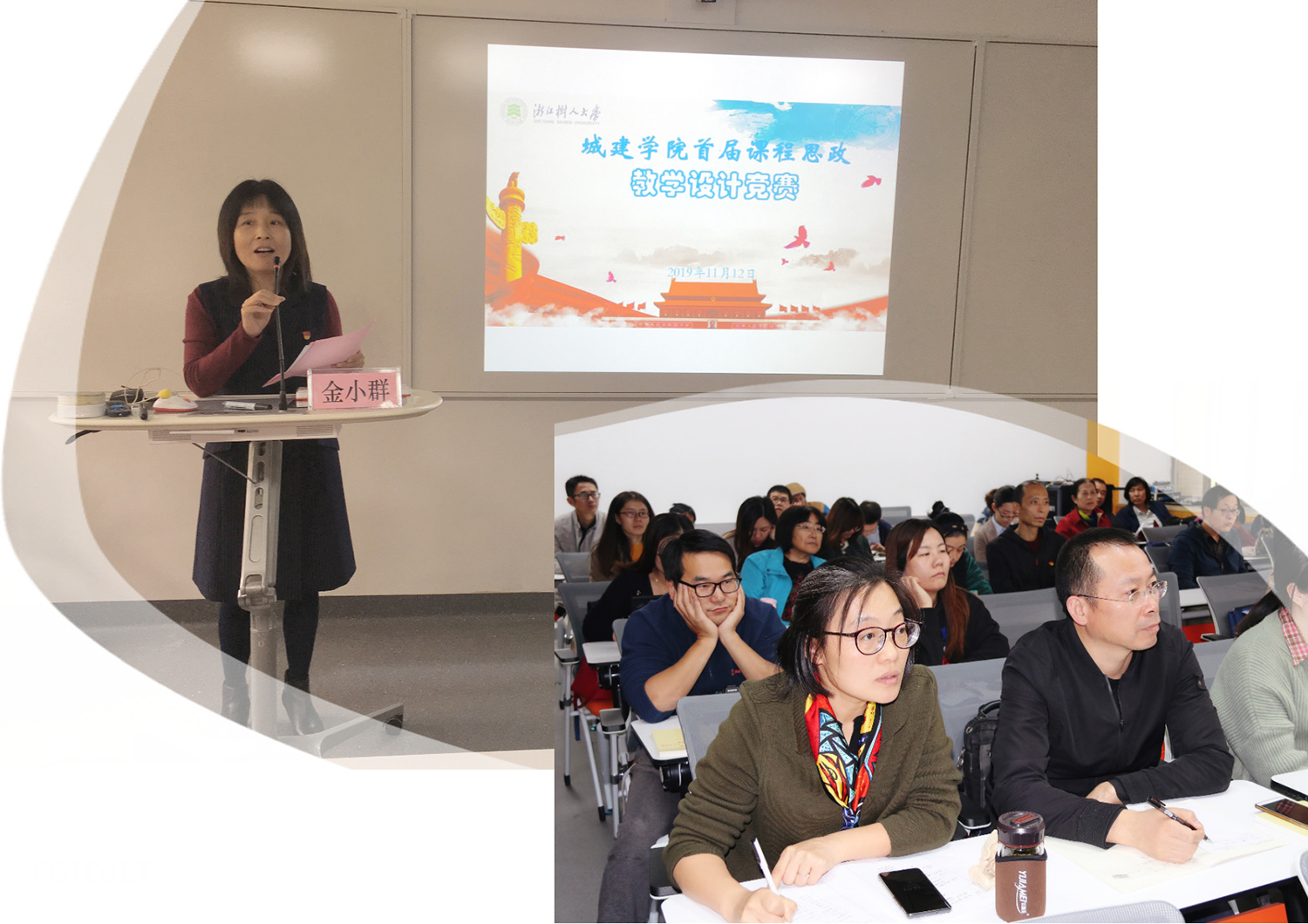 为深入贯彻全国高校思想政治工作会议和新时代全国高等学校本科教育工作会议精神,推动《浙江树人大学课程思政教育教学改革实施意见》的落实落地,结合学校“教学质量月”部署,城建学院于11月12日下午13:30在A4-208教室举办了首届“课程思政”课堂教学设计竞赛。校教务处处长夏晴、校质量监控中心主任陈超祥莅临现场指导,城建学院院长姚谏、城建学院党委书记田国庆、马克思主义学院教学副院长张玲作为评审专家参加了此次评比,城建学院全体教职工到现场观摩学习。