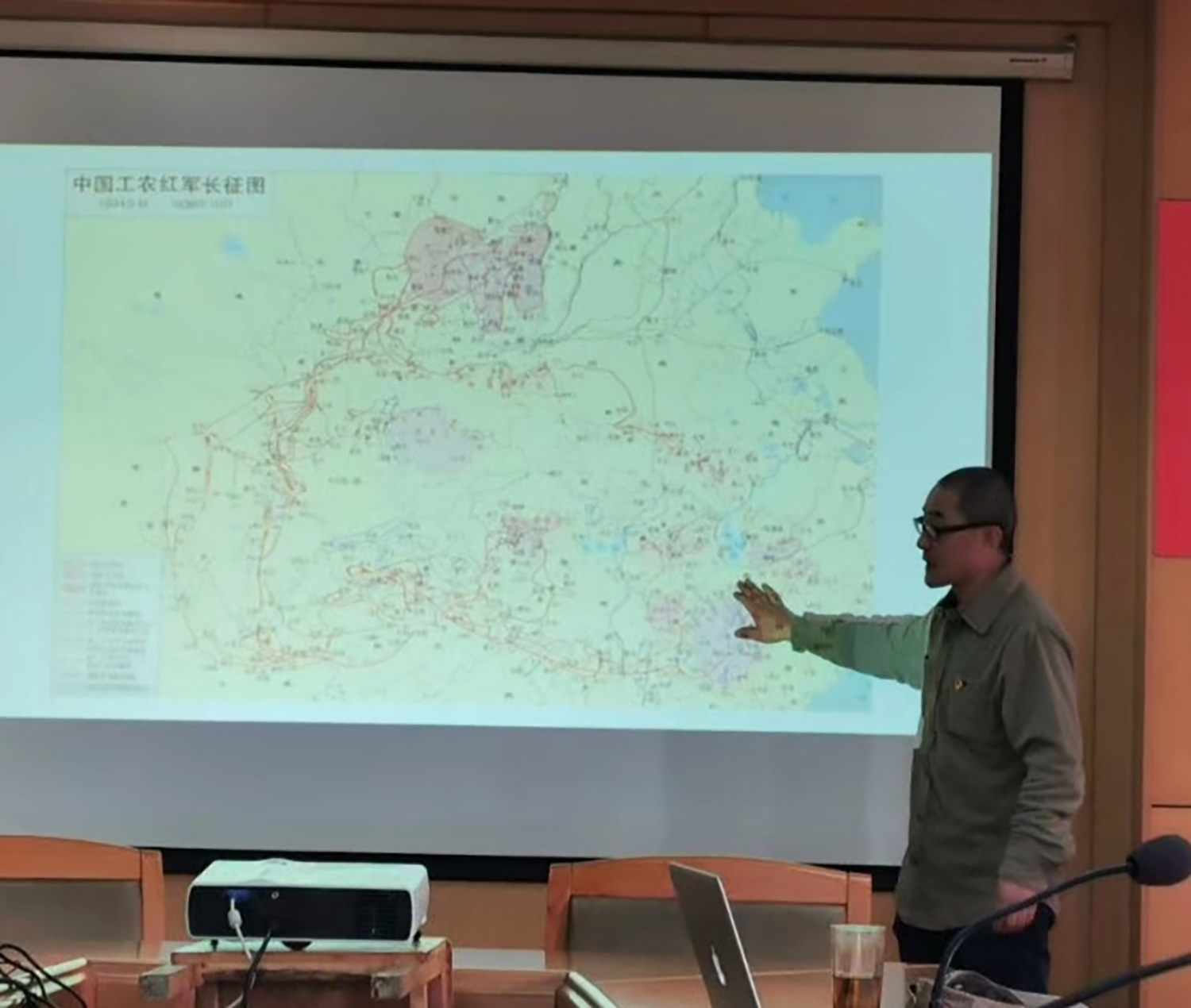 副院长林涛给大家主讲了《长征的意义与现实思考》的主题党课,回顾了长征的历程和历史转折点,长征期间红军领导集团的变化、年龄构成,外国记者学者对红军长征的报道,最后提到在学院办学中我们要学习红军长征精神,不怕苦不怕累,凝心聚力直面面对各种困难,推进学院发展。