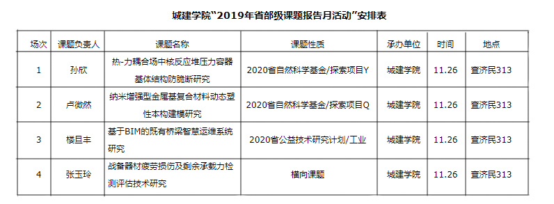 11月26日下午,城建学院在査济民313会议室召开全院大会,会议分为两个阶段,第一阶段为2019年省部级课题报告月学术交流活动,由学院院长姚谏教授主持;第二阶段为姚谏院长上党课,由学院党委书记田国庆副教授主持。