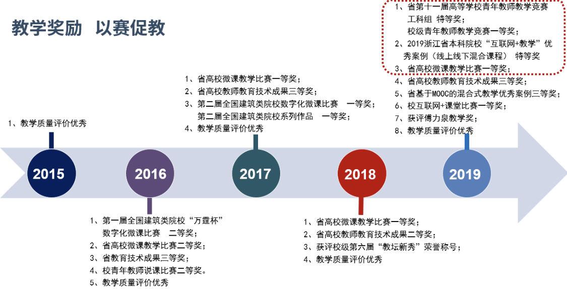 正是这样一种对于教学的这种热爱,奠定了耕耘的基础,也奠定了收获的基础。赵欣老师凭借《建筑制图》课程在青年教师教学技能竞赛和省级、国家级的微课比赛中获得了无数奖项,取得了骄人的佳绩。2016年获得校青年教师应用型说课比赛二等奖,浙江省高校教师教育技术成果奖三等奖,浙江省高校微课教学比赛二等奖,全国第二届建筑类院校数字化微课比赛本科类作品二等奖。2017年荣获全国第三届全国建筑类院校数字化微课比赛本科组单个作品一等奖和系列作品一等奖。2018省高校教育技术成果三等奖。2019年赵欣老师通过学校层层选拔,获得校青年教师技能竞赛一等奖,在浙江省第11届高校青年教师教学竞赛中,赵老师的课堂教学得到了现场评委的一致认可,最终获得了工科组特等奖的荣誉。此外,赵欣老师还获得了2019年省高校微课教学比赛一等奖,2019年浙江省本科院校“互联网+教学”优秀案例中赵欣老师特等奖。