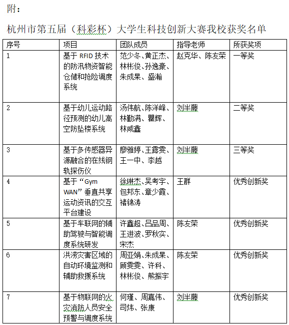经过激烈的现场比拼,最终决赛产生一等奖6个、二等奖10个、三等奖14个、优秀创新奖21个。我校信息科技学院赵克华、陈友荣老师指导的《基于RFID的防汛物资智能仓储和抢险调度系统项目》荣获一等奖,信息科技学院刘半藤老师指导的《基于幼儿运动路径预测的幼儿高空防坠楼系统项目》荣获二等奖,信息科技学院刘半藤老师指导的《基于多传感器异源融合的在线钢轨探伤仪研发项目》荣获三等奖。此外,我校还有4个参赛项目获得大赛“优秀创新”奖。