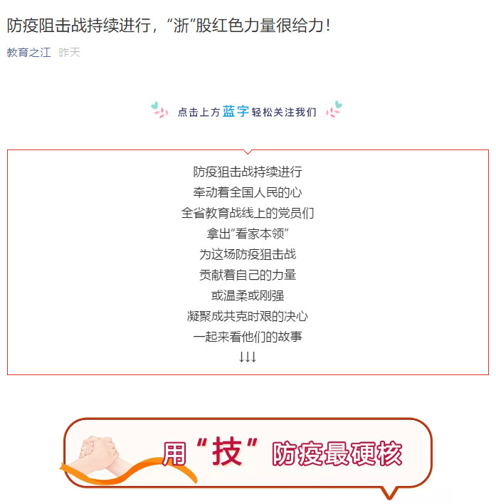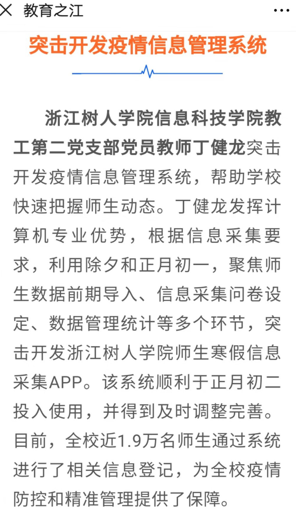 2月4日,省教育厅官方微信公众号“教育之江”也对丁健龙老师的先进事迹进行了报道,丁健龙老师在疫情防控工作中守初心、担使命,发扬了敬业奉献的树大人精神。抗击疫情阻击战形势依旧严峻,希望全校教工党员能够带头坚守岗位,做到守土有责、守土担责、守土尽责。