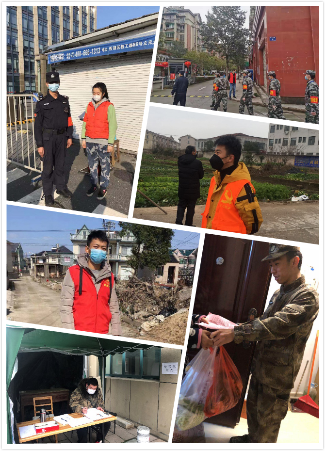 从疫情开始,健管学院护理专191班金心羽、生环学院环工171班朱承诚、管理学院财管182班卢宇伟、艺术学院视传172班张磊、现服学院会展181班徐晓寅、信息学院电子工程171班黄佳伟等同学分别在杭州西湖区西溪街道、江苏江阴市长泾镇长东村、金华东阳江北街道、宁波市鄞州区首南街道、衢州市开化县岙滩社区、宁波市象山县定塘镇漕港村参与抗疫防控工作。他们挨家挨户发放告知书、执勤站岗、登记进出人员和车辆信息、测量体温,巡逻劝导未戴口罩和聚众聊天人员。每天在户外寒风中工作近十个小时,虽然辛苦,但每个同学都说“值!能为社区尽微薄之力,有满满的成就感和自豪感。”