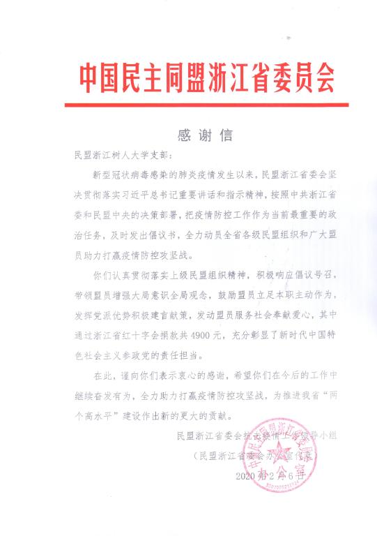 在全国上下一心、团结一致抗击新型冠状病毒战役中,民盟浙江树人大学支部迅速行动起来,积极主动奉献盟员们的一份力量,充分体现了盟员的担当与情怀。支部委员会发出了所有盟员上交一次特别盟费的号召后,1月29日短短一天,就收到了20余名盟员的4900元特别盟费。通过浙江省红十会渠道进行了捐助,希望能为湖北、浙江购买狙击疫情购买医用物资尽绵薄之力。这项活动受到了民盟省委会的高度赞扬,还收到了来自民盟省委会的感谢信。