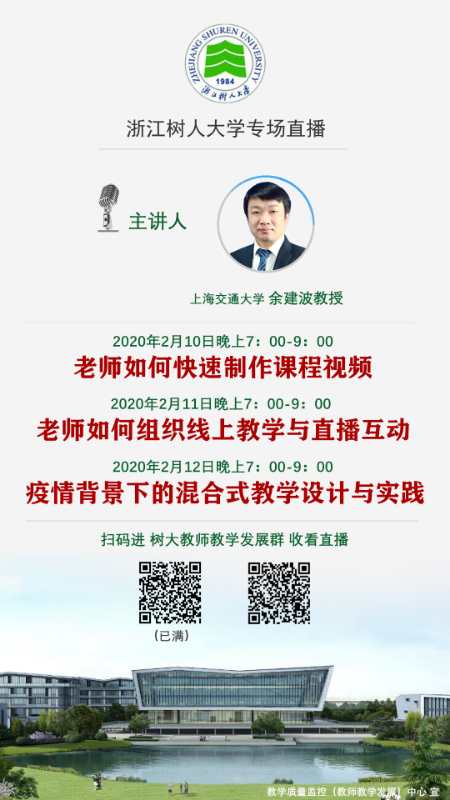 突如其来的疫情改变了传统的授课模式,按照教育部的倡议“停课不停教、停课不停学”,老师们应做好哪些在线教学准备、线上教学方法有哪些和如何组织在线教学?为此,我校教学质量监控中心专门邀请了上海交通大学余建波教授于2月10日、11日、12日三个晚上为我校老师进行了专场直播:如何快速制作课程视频,如何组织线上教学与直播互动,如何进行线上混合式教学设计与实践,在各教学单位的积极动员和组织下,全校500余位教师积极参加了在线学习和讨论。