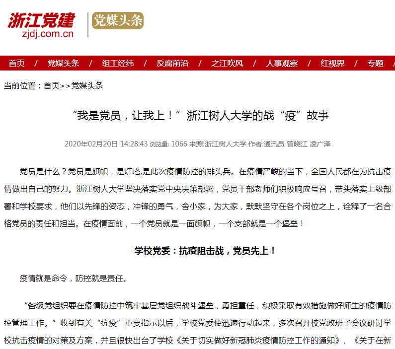 自新冠肺炎疫情以来,全国人民都在为抗击疫情做出自己的努力。我校党委坚决落实党中央决策部署,党员干部老师们积极响应号召,带头落实上级部署和学校要求,他们以先锋的姿态,冲锋的勇气,舍小家,为大家,默默坚守在各个岗位之上,诠释了一名合格党员的责任和担当。在疫情面前,一个党员就是一面旗帜,一个支部就是一个堡垒!涌现出了很有先进的师生党员战“疫”的故事。1月20日,浙江党建网进行了宣传报道。