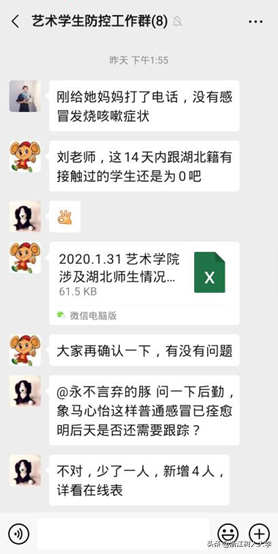 在接到学校部署的防控排查工作后,艺术学院第一时间组建了艺术学院防控工作群。分线分块负责、网格化覆盖,明确了各自任务与分工,及时、高效地完成各项排查工作。为了满足防控工作不同阶段的工作要求,他们设计了各类在线表格用于信息搜集。为了让师生员工们坚定疫病可防、可控、可治的信念,他们联合学院辅导员、班主任与学干,在班子群中普及科学疫情防治相关知识,及时搜集反馈,保证与师生们的交流与沟通。