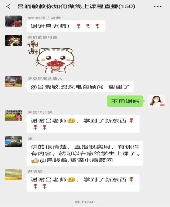 吕晓敏老师在微信群进行了主题为“如何做线上课程直播”的分享。直播中,吕老师分别列举了两个软件的直播讲课方法:第一,她围绕“学习通”讲述如何考勤、互动、做测试、课堂评价、与qq群结合讲课、直播回放等,实时和老师进行互动,详细解答疑问。第二,她推荐老师们在“课堂派”的网站上创建群聊、进行直播讲课,还找了同学帮忙做互动演示。
