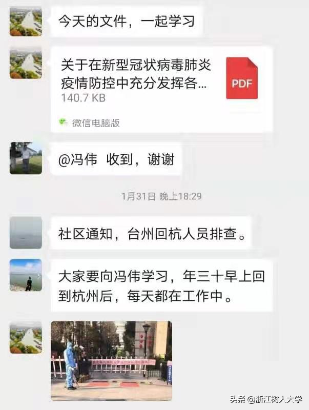 “早回去隔离早上班”到“居家隔离坚持上班”,这是校办公室副主任、机关一支部书记冯伟的真实写照。放假回到爱人湖北老家后还不到三天,考虑到肺炎疫情的不断蔓延和学校工作的需要,他毅然于除夕日凌晨自驾回到杭州,回杭后全家自觉在家隔离,并主动向学校和社区报告。从回到杭州开始,他就主动请缨,从大年三十至今从未停歇地参与到疫情防控工作中。每天在家坚持协助做好数据排摸统计、全校师生寒假信息采集APP程序开发、省教育厅信息收集及上报等大量工作,为学校快速把握师生动态和疫情防控做出了突出贡献。身为一名党员,冯伟有着强烈的责任心,主动作为,以实际行动诠释了一名共产党员的担当。