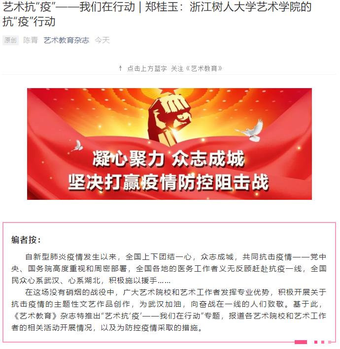 一场突如其来的新型冠状病毒感染的肺炎疫情从武汉向全国蔓延,举国哗然。面对疫情,全国上下,众志成城,展开了一场没有硝烟的战役。各艺术院校也在这场抗击病毒的大背景下行动起来。浙江树人大学艺术学院党委书记、副院长郑桂玉接受采访时表示:“当我校收到有关‘抗疫’重要指示后,浙江树人大学校党委便迅速行动起来,多次召开校党政班子和抗疫领导小组会议,落实部署‘疫战’防控工作举措。我们艺术学院按照学校的部署,也随即成立了疫情防控工作小组,形成学院领导、办公室、辅导员、班主任、班团支书五级制网格化防控管理模式,分线分块负责、网格化覆盖,及时高效地完成各项排查工作,特别是学院副书记、办公室、辅导员、班主任和班团干部在日报排查中严谨仔细、日日坚守。同时也及时普及科学疫情防治相关知识,让师生坚定疫病可防、可控、可治的信念。”