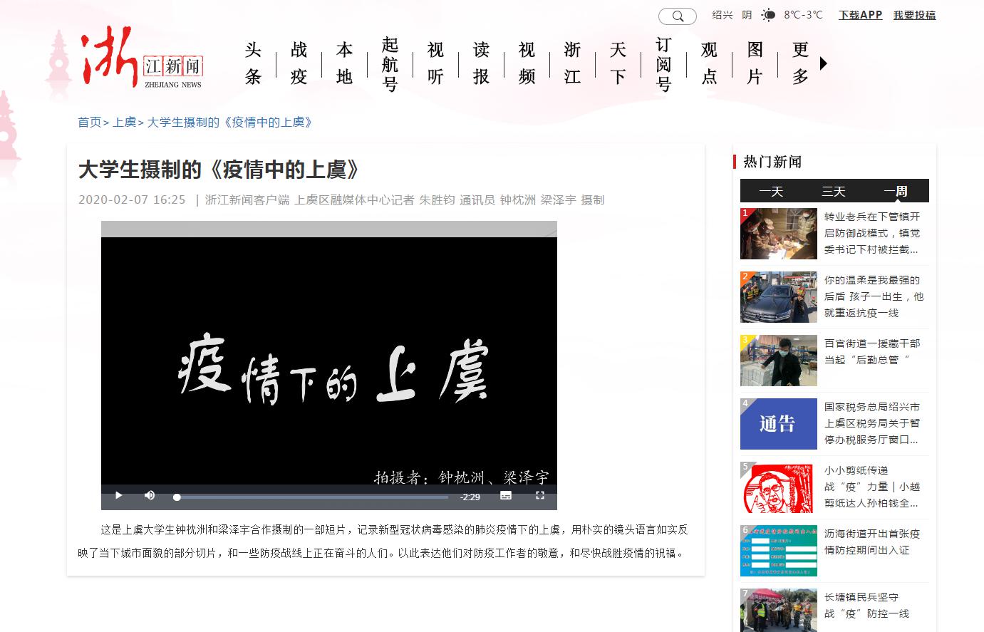 疫情肆虐,举国战“疫”,有感于网上各类为武汉助威视频的启发,信息学院通信工程182班梁泽宇便想为自己的家乡绍兴上虞制作一个助威视频,让大家可以看到上虞那些奋斗在抗疫一线的“逆行者”,也为大家能够齐心协力战胜这场战“疫”加一把劲。历时四天,跑遍上虞城北、城西、城东、城南四个地区,数个街道小区,取景拍摄制作,于是这部《疫情中的上虞》助威视频便这样诞生,并登上浙江新闻,受到大家的广泛赞赏和热议,凝聚并增强了大家抗击疫情的信心。