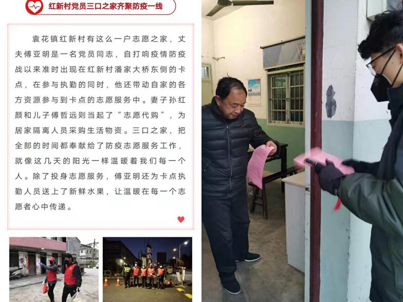 傅哲远,来自海宁袁花镇红新村,是生物与环境工程学院食品科学与工程181团支部的一员。寒假期间,突如其来的新型冠状病毒感染的肺炎形势严峻,傅哲远看着身为老党员的父亲为村里的安全日日奔波,他毅然决定和父母一起投身到村里的防疫一线。自打响疫情防疫战以来,傅哲远每天关注着居家隔离人员,因为疫情原因,很多村民无法外出采购菜虚品日用品,傅哲远和妈妈孙红颜一起当起了“志愿代购”,为居家隔离人员采购生活物资,同时也把疫情的最新消息和防护措施普及给村民们。而傅哲远的父亲则是每次准时出现在红新村潘家大桥东侧的卡点,参与执勤。三口之家,牺牲了过年团聚和休息的日子,把全部的时间都奉献给了红新村的防疫志愿服务工作。为此当地的公众号“两美袁花”也报道了傅哲远一家的事迹。