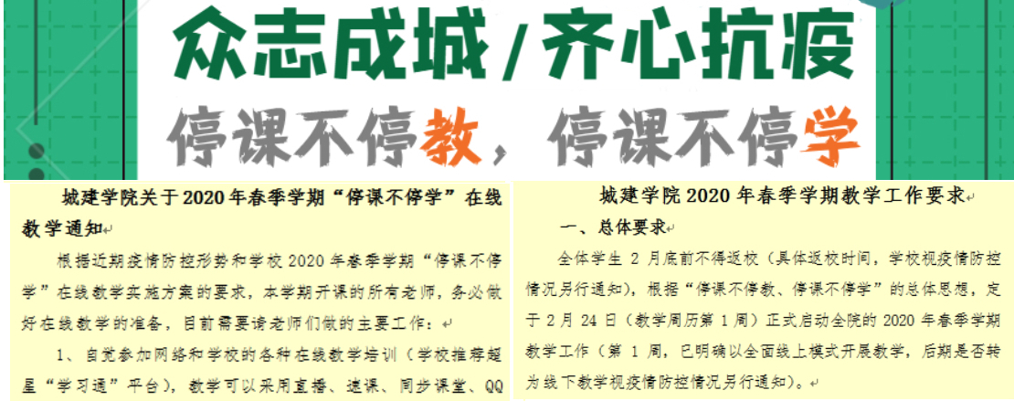 学院领导班子积极响应省教育厅和学校号召,精心组织在线教学准备工作,制定了“城建学院2020年春季学期教学工作要求”,确保在疫情期间做到“停课不停教、停课不停学”,全院师生众志成城,齐心抗“疫”。