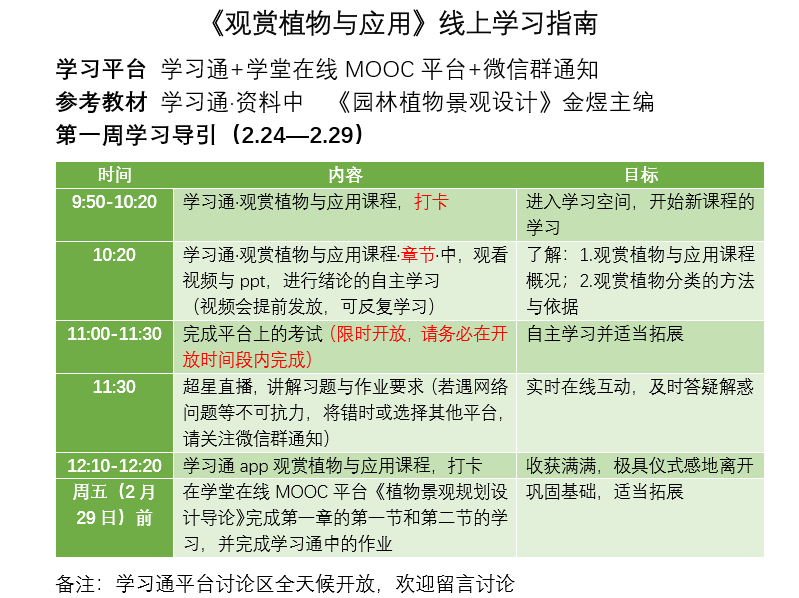 课前,老师们提前建立班级上课群,将教学视频、课件等资源上传至班级微信群或QQ群,并布置相应的预习任务,确保每位学生了解开课方式及课程要求。老师们采用“线上学习指南”的方式组织课程教学,让学生对课程学习内容、目标等一目了然。