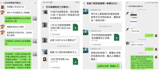 学院接受学校防控疫情部署后,学院党委迅速行动,成立了一支由六名教师党员、一名学生党员和一名入党积极分子组建了党员团队,率先担负起了艺术学院防控疫情的先锋力量。随后构建了由学院党政领导、办公室、辅导员、班主任、班长团支书、班级二级联络人组成的五级网格化防控管理团队,层层落实,严查细排,分线分块负责、网格化覆盖。做到师生信息全掌握、底数全摸清、台账全建立、动态全明了,信息一个不落,严格落实各项防控任务。同时及时普及科学疫情防治相关知识,让师生们坚定疫病可防、可控、可治的信念。为能确保及时完成日报工作,打卡时间及早前移至12点,预留应急处理空间,确保摸排打卡等工作及时高效完成。