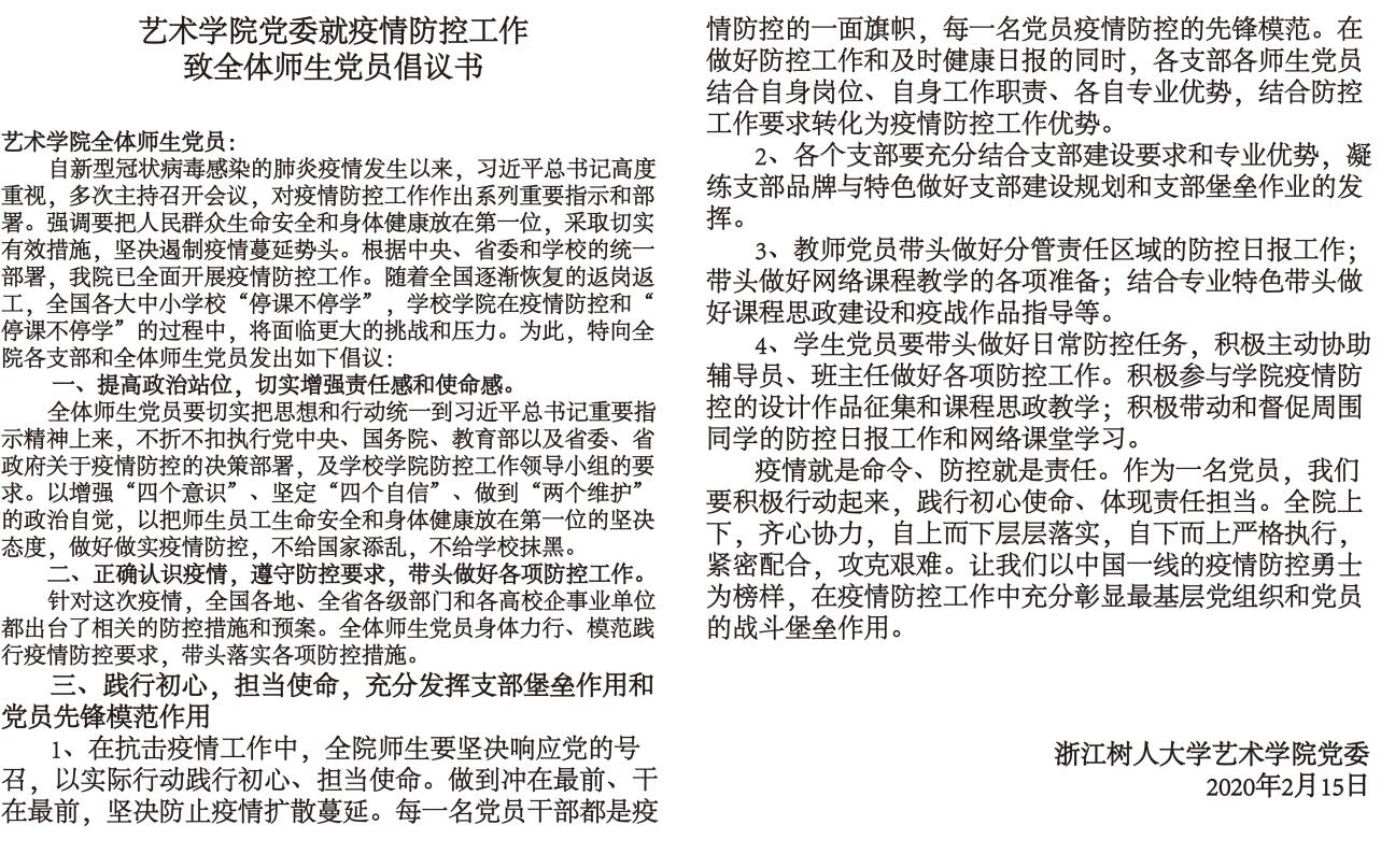 思想是行动的指南。作为基层党委,积极响应、落实党中央、上级党委的号召,向全体师生党员发出了《艺术学院党委就疫情防控工作致全体师生党员倡议书》,动员全体师生党员积极行动起来,立足岗位,发挥各自优势,在各个岗位上诠释一名合格党员的责任和担当。