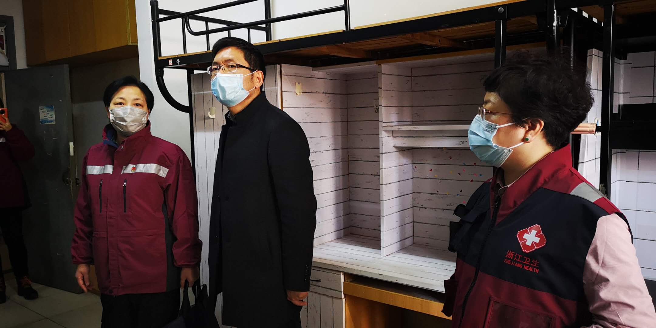 厉主任深入餐厅、隔离观察点、卫生所等进行了实地指导。她充分肯定了前期学校在防控疫情方面所做的大量工作,并就师生分批用餐、师生测温、隔离观察点人员配备、物资配备、人员流转等工作进行了具体指导。她表示,拱墅区疾控中心将尽力支持学校的防控工作,共同打赢防控攻坚战。