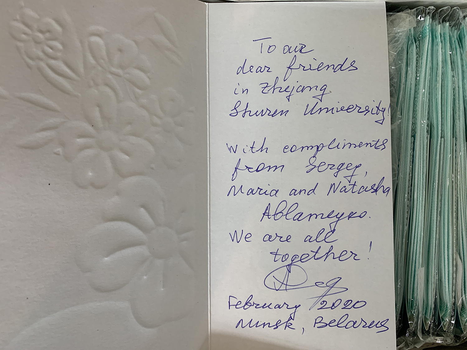 据院士回忆,白俄罗斯二月份还没有实施限购口罩,但是单个药店里口罩数目也不多,他联系了药店、口罩生产厂家,同时也请白俄罗斯卫生部亚历山德罗夫国家肿瘤心副所长,曾经于2018年11月访问我校的谢尔盖•克拉斯尼院士一起协助,费了很大周折才凑齐了这些口罩。虽然数量不多,种类不一,但是哪怕只有一点点,也希望能尽自己的绵薄之力,能解我们的燃煤之急。