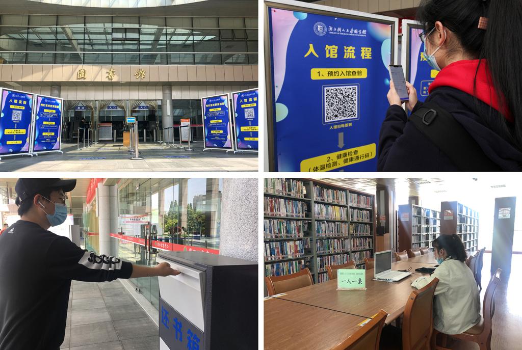 4月29日早8:00,关闭三个多月之久的拱宸桥校区图书馆终于打开了大门。第一批预约成功的读者如约而至,出示校园通行码,入馆扫码,体温检测,一整套流程快速完成,顺利走进了阔别已久的图书馆。