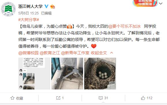 近日,我校学生已分批安全有序的返校,校园里一下子便热闹了起来,而这几日树大师生的“朋友圈”被一个鸟窝“刷屏”了。许多网友纷纷在学校官方微博上留言“太有爱了”、“希望官博每天能记录它们的状态哈”、“学校太可了,希望它们健康快乐的成长”,一时间这窝被称为“乌鸫”的小鸟,瞬间成了“校宠”。还吸引了钱江晚报、浙江日报、杭州电视台等媒体的宣传报道。