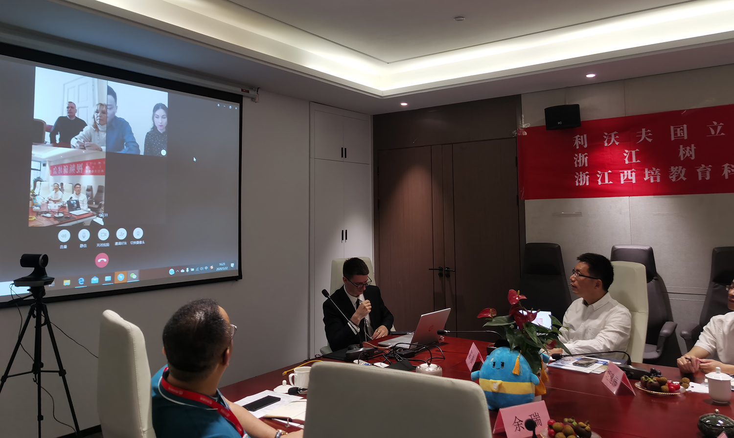 2020年5月21日下午,在萧山区的中乌文化交流中心,陈浚副校长率国际交流与合作处负责人与乌克兰利沃夫国立理工大学代表开展洽谈,此次会谈以视频方式进行。利沃夫国立理工大学方由楚赫莱·娜塔莉娅副校长率队与我方进行交流,参会代表还有国际教育中心主任高兹·娜塔莉娅,国际留学生主任谢尔盖·库普恰克以及中乌合作主任米哈·伊洛。