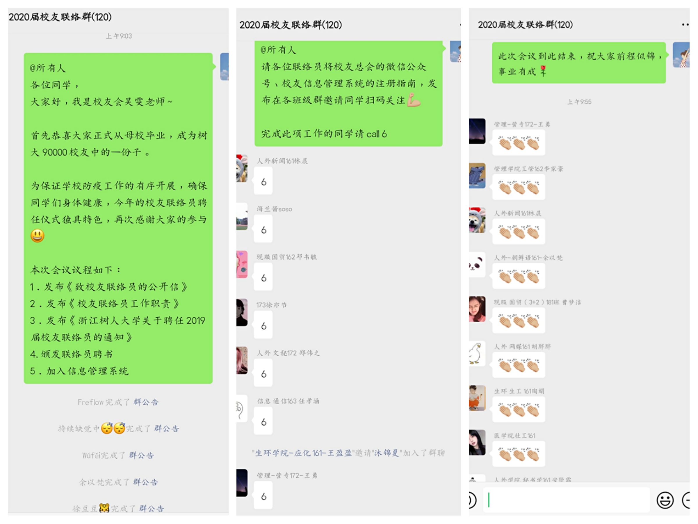 会上,校友会发布了《致校友联络员的公开信》、《校友联络员工作职责》、《浙江树人大学关于聘任2020届校友联络员的通知》,并为154名2020届校友联络员颁发了聘书。根据职责要求,联络员将负责本班级、专业与校友会间的联络工作,及时收集并向校友会反馈广大校友对学校的意见和建议。会上,联络员们纷纷表示,将继承和弘扬学校的优良传统,认真履职积极推动校友工作。校友会号召广大校友团结在校友会的旗帜下,互帮互助,共同发展。