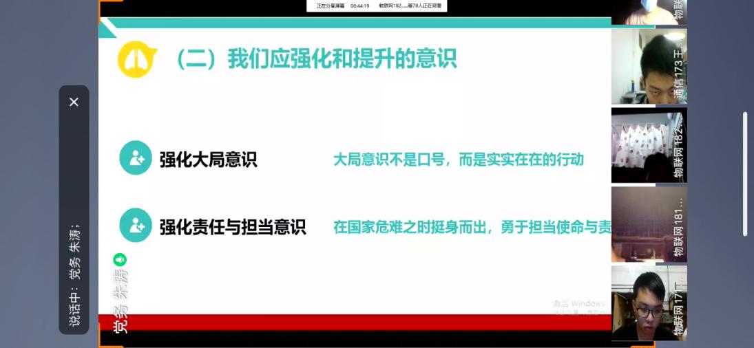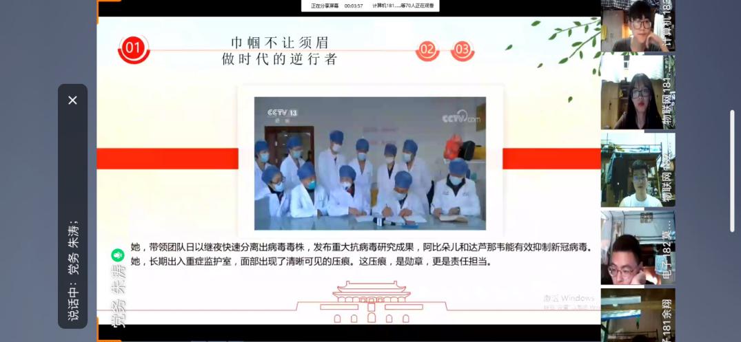 本次党校向学员们展示多个学院的老师制作的微党课视频。分别是信息科技学院蒋维老师的《不同的岗位,同样的担当》,城建学院赵欣老师的《奋斗有我,筑梦中国》以及树兰医院国际医学院葛玉花老师的《医者仁心,牢记使命担当》等优秀微党课。在此次党课中各位老师向学员们介绍了在疫情中不畏艰苦、不畏牺牲的逆行者——医护人员,熬夜开发树大打卡系统的丁健龙老师,为消毒产品腾出生产线、电商助农的树大学姐王一爽,以及面对疫情快速更改教学模式的各位老师。无一不展现出青年一代是有理想、有担当的一代。