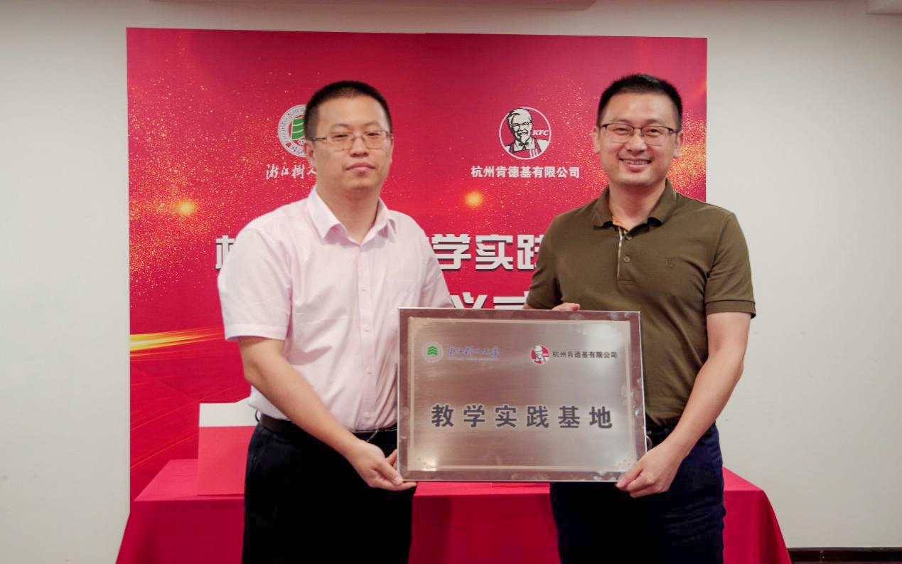 随后,吴俊杰院长与肯德基朱章磊经理进行了校企合作签约仪式,高孟立副院长与何锡跃经理进行了教学实践基地授牌仪式,钮王栋经理向潘瑞玉、诸葛剑平颁发了校外指导老师聘书。