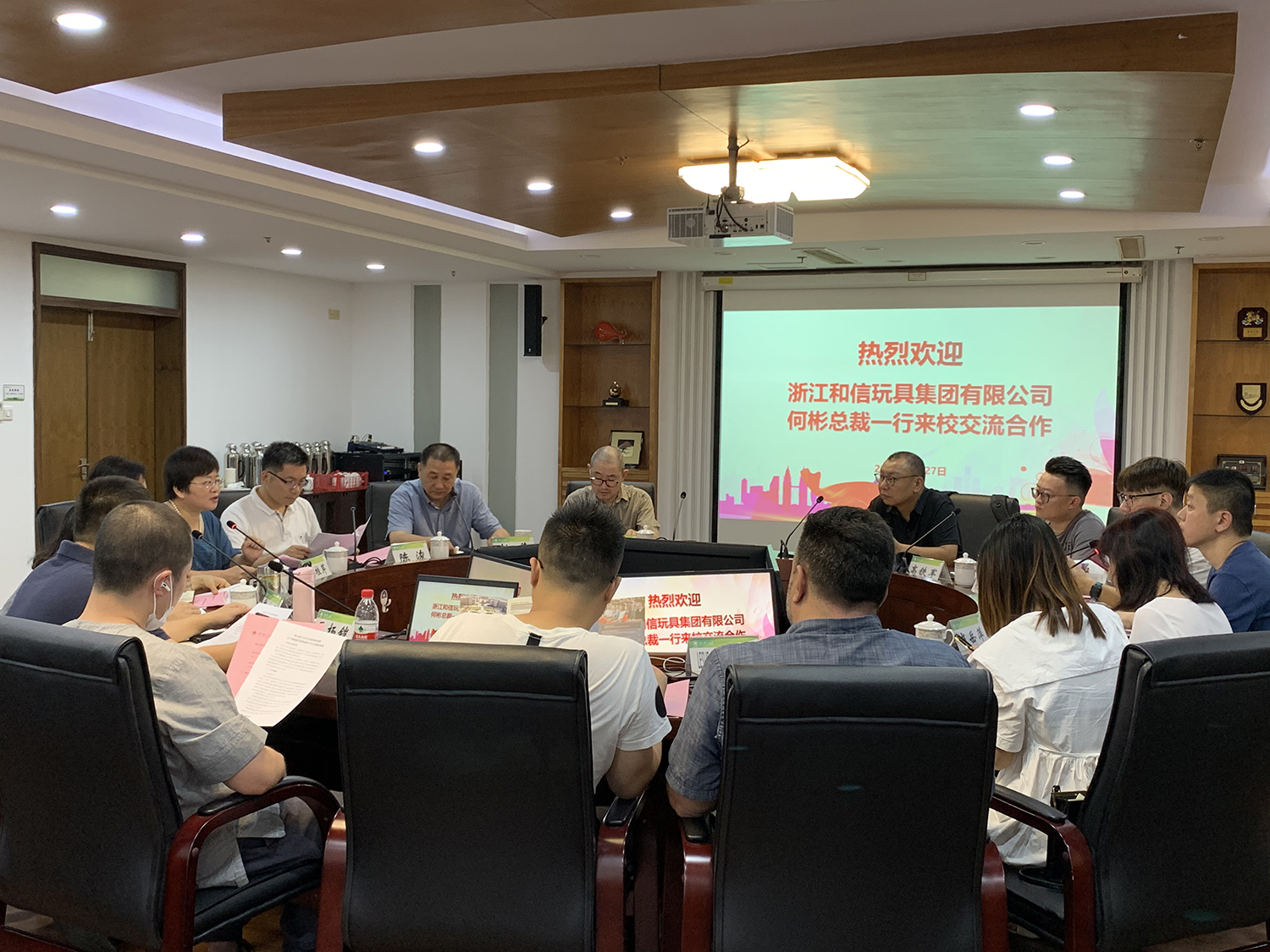 8月27日下午,浙江和信玩具集团有限公司总裁何彬率队来校洽谈校企合作事宜。校纪委书记陆桂芹、副校长陈浚以及国际交流与合作处、艺术学院等相关单位负责同志参加交流座谈会。会议由艺术学院副院长林涛博士主持。