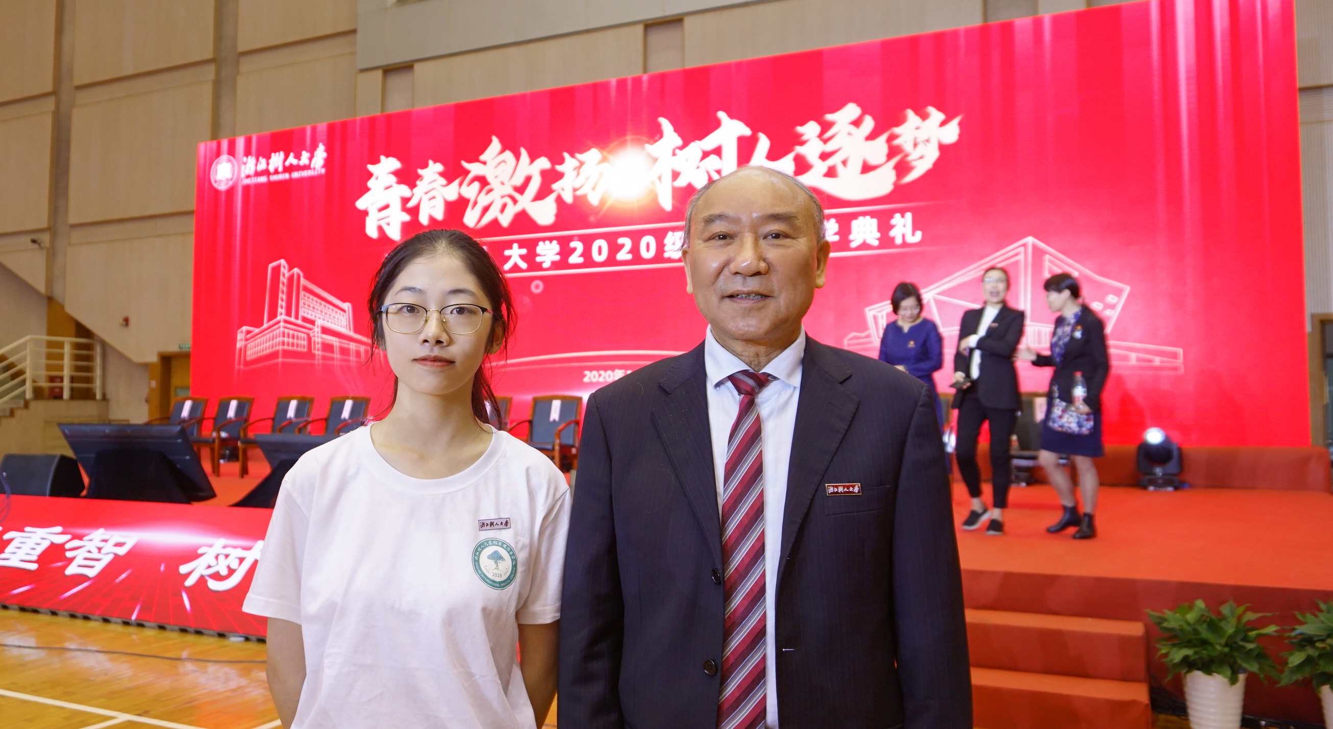 上午9时,典礼在雄壮的国歌声中拉开序幕。校领导和嘉宾为新生代表佩戴校徽,全体新生一起佩戴校徽,从此同学们与“浙江树人大学”真正血脉相连。