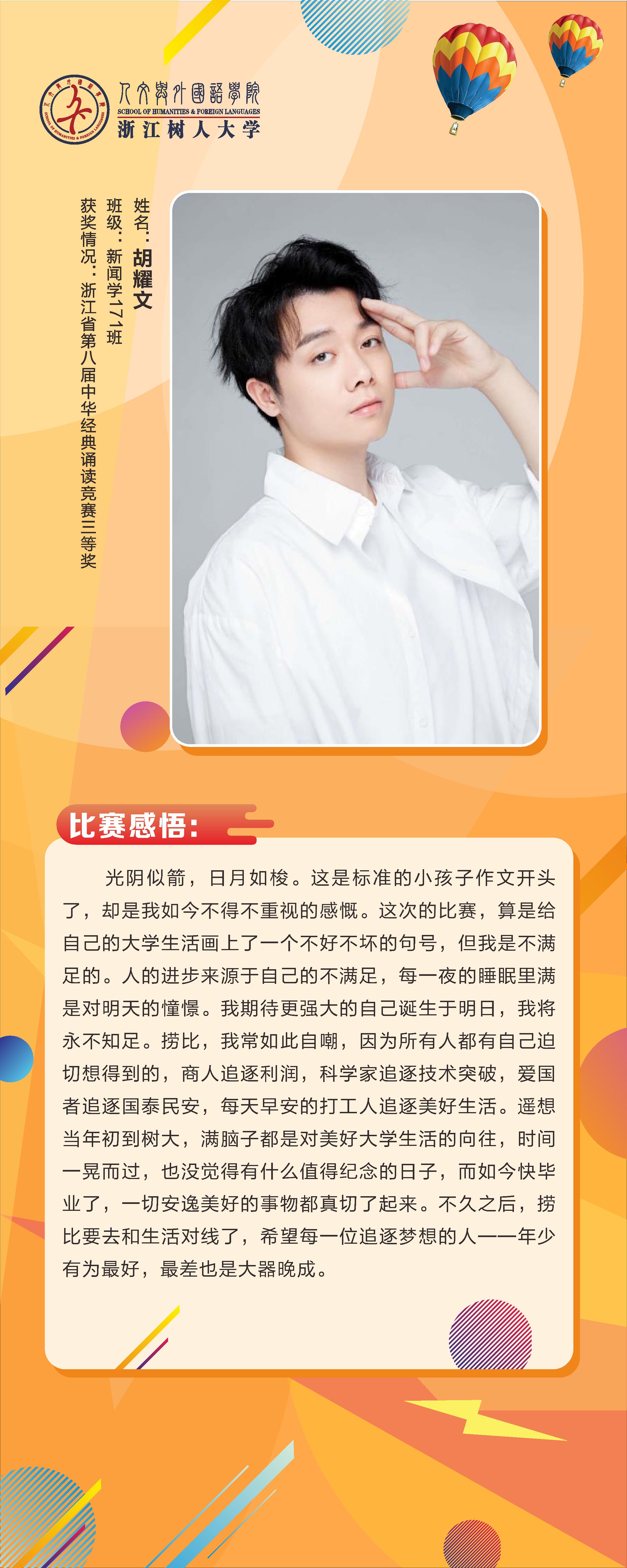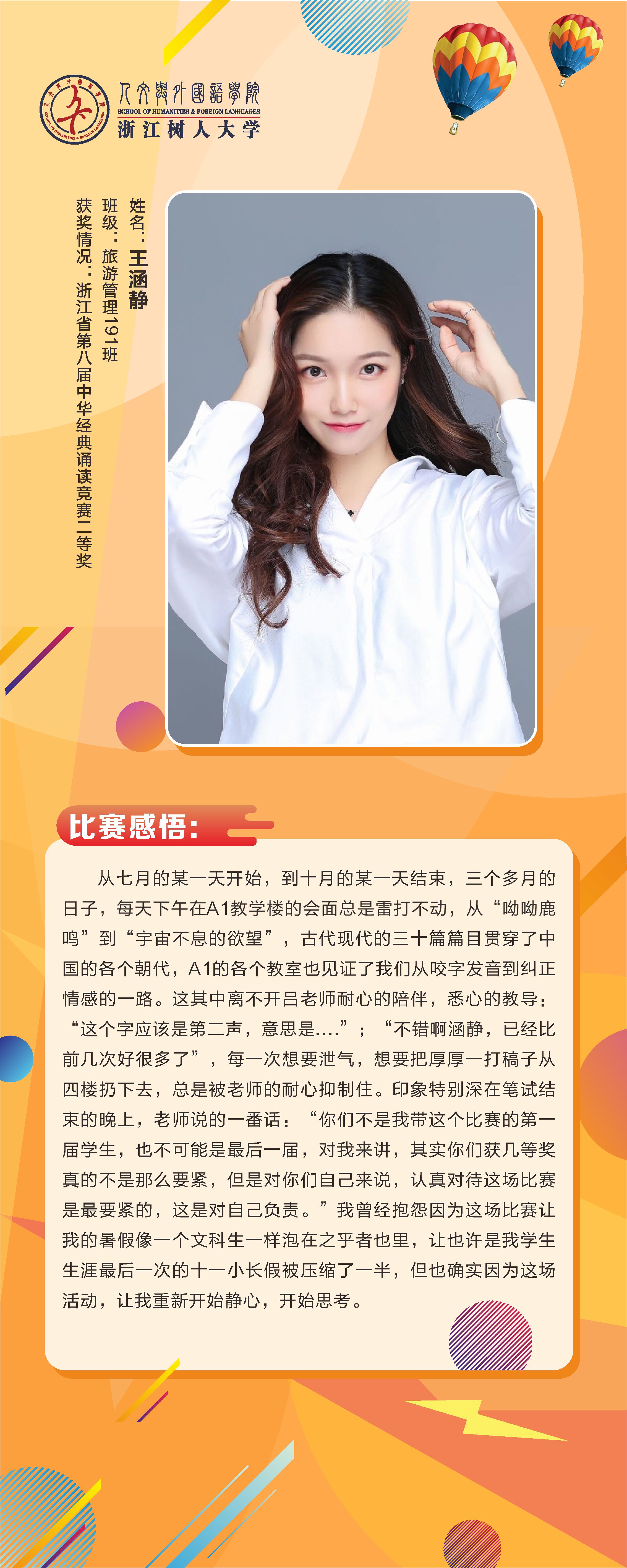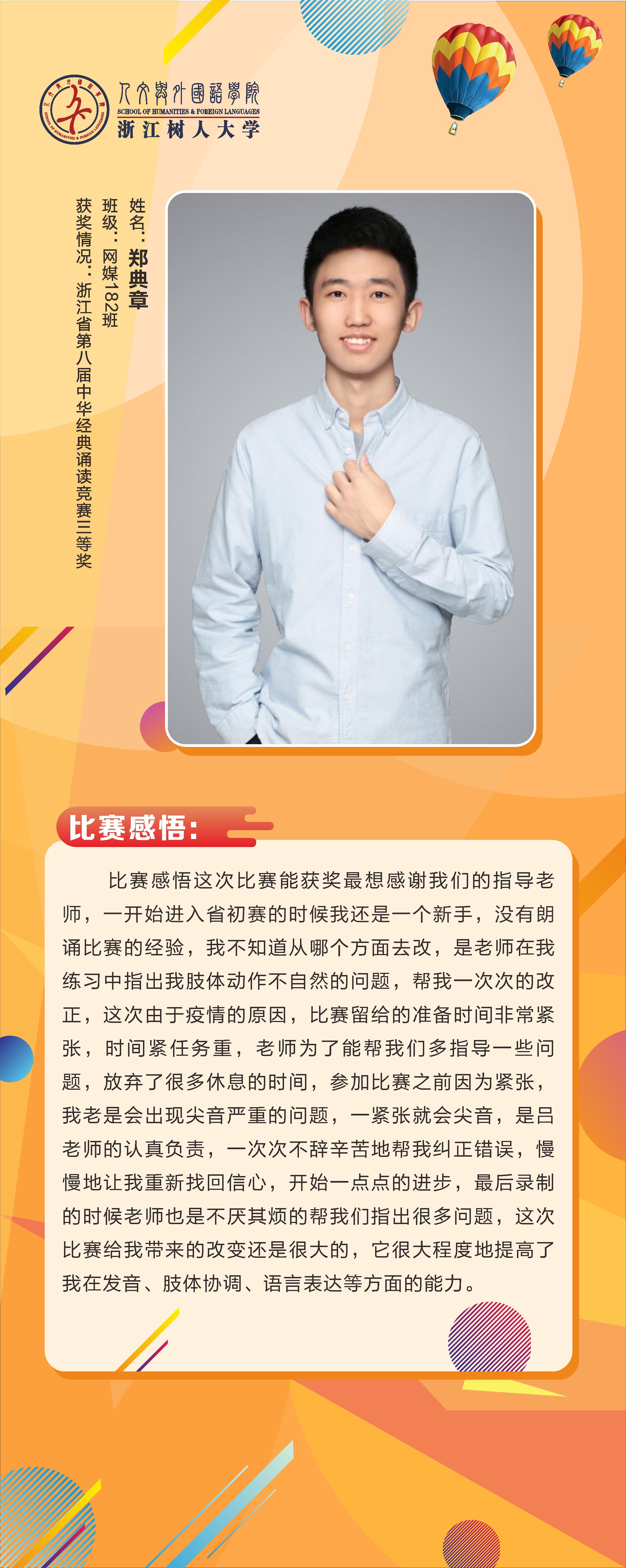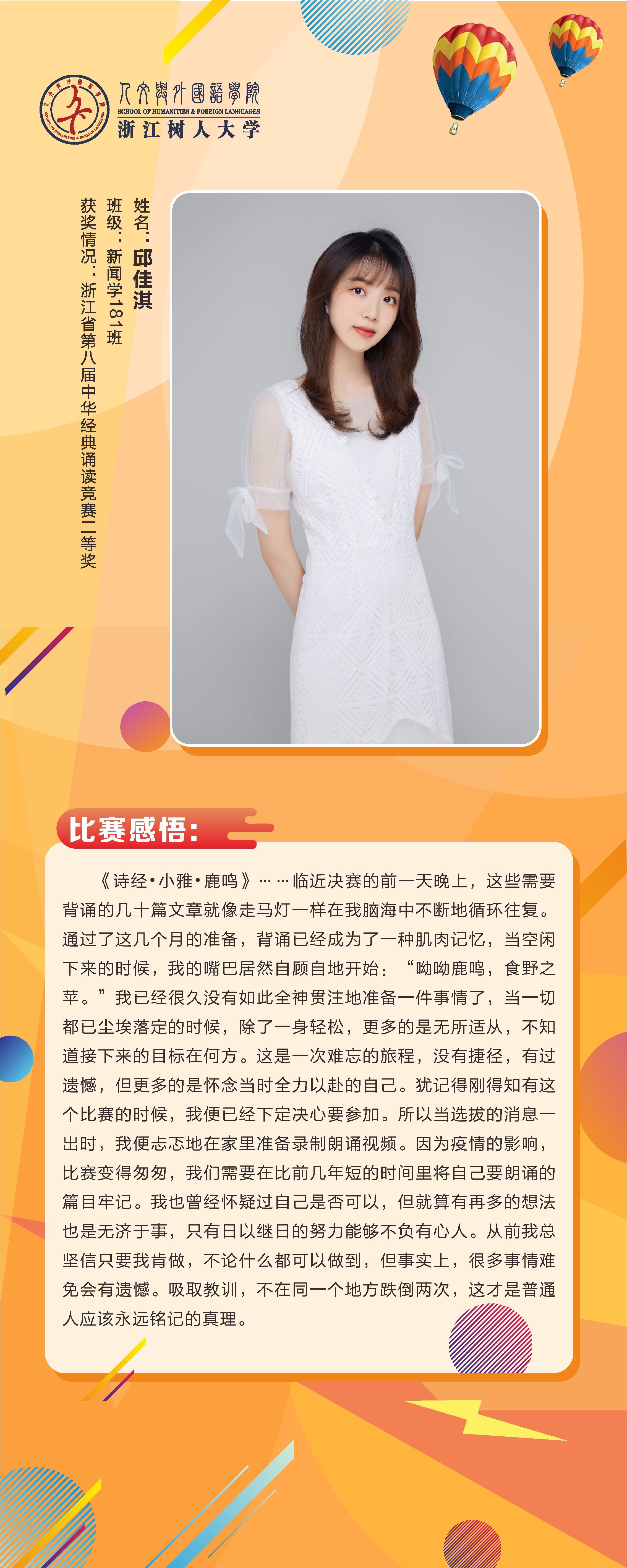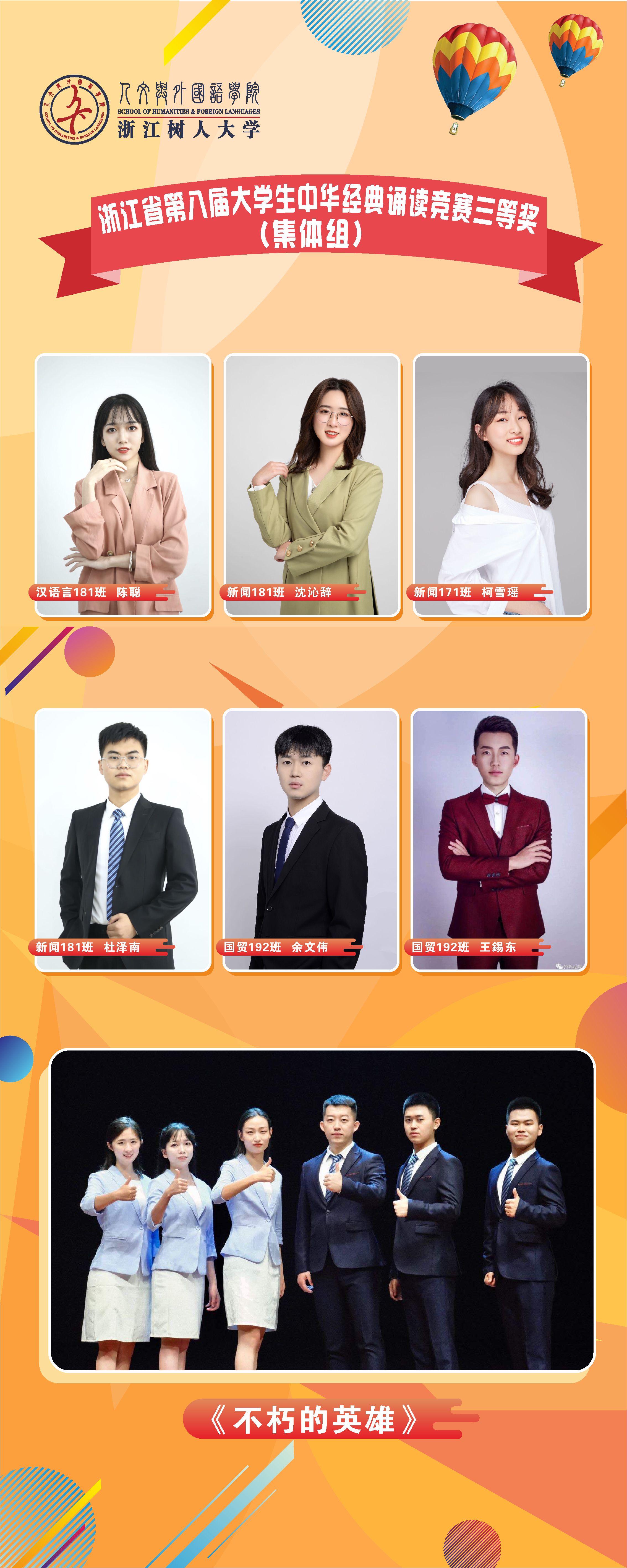 10月18日,浙江省第八届大学生中华经典诵读竞赛决赛(省甲竞赛)在绍兴文理学院顺利落幕。我校人文与外国语学院汉语言文学专业吕红光、孙旭辉等几位专业教师在学工、教学等部门的配合与帮助下,所指导选手在本次大赛中获得一等奖1项,二等奖3项,三等奖3项,共计7个奖项。本次大赛分为个人组与集体组,其中个人组有6个选手获奖:来自于英语专业的吴贝同学获得一等奖;汉语言专业洪盼悦、新闻学专业邱佳淇与旅游管理专业王涵静三位同学均获得二等奖;新闻学专业胡耀文、网媒专业郑典章两位同学均获得三等奖;集体组作品《不朽的英雄》获得省三等奖,由汉语言专业陈聪与新闻学专业杜泽南、沈沁辞、柯雪瑶以及国贸专业的王锡东、余文伟等6名同学共同完成。
