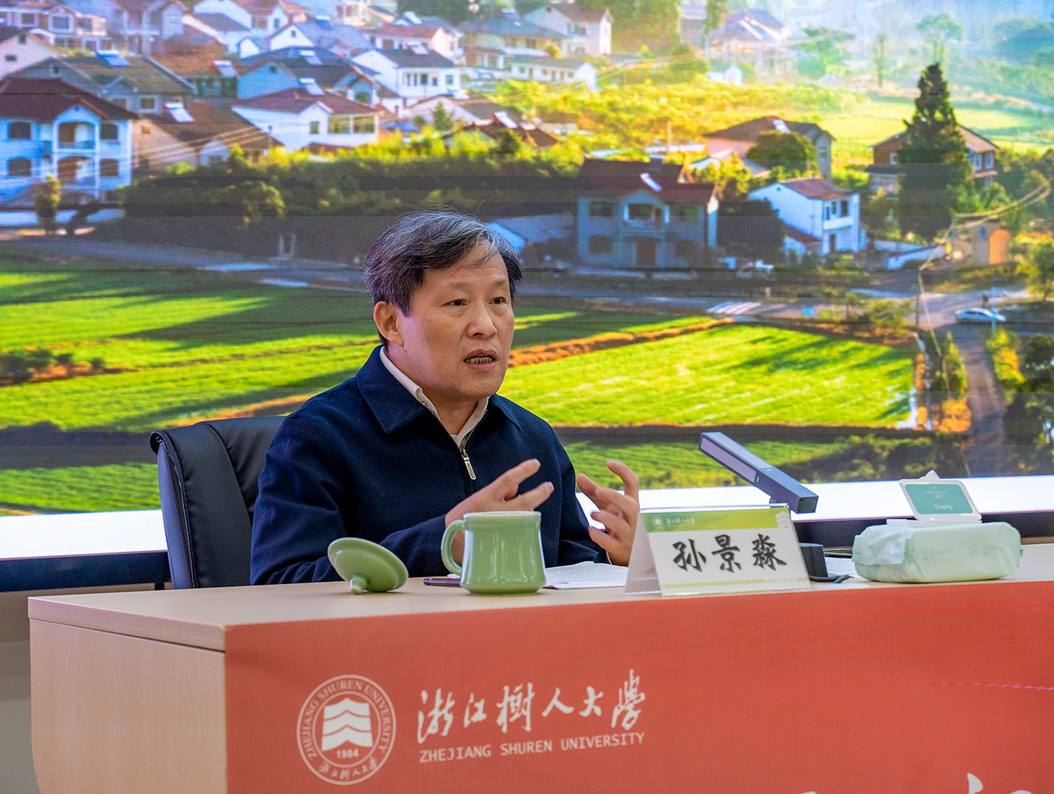 随后,孙景淼副主席作了题为《乡村振兴的路径选择》的主题报告。他围绕“城乡一体实施乡村振兴战略”、“分类失策推进乡村全面振兴”、“融合发展汇聚乡村振兴力量”和“改革创新激发乡村振兴功能”四个方面,以深远的历史视野回顾了新中国乡村道路的探索历程、以深厚的实践积累总结了浙江乡村振兴的经验、以深刻的理论思考提出了具有样板意义的浙江乡村振兴高质量发展的路径。他指出,在习近平总书记的领导下,在党中央的号召下,只要我们共同努力,乡村振兴的路子一定会越走越宽广,一定会在神州大地上体现出它的价值和辉煌。