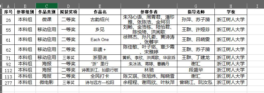 本次大赛,学生通过平面海报、移动应用、微电影、微课等多种手段和方式彰显浙江的美丽诗画风景。其中,信息学院学生刘畅等创作的移动应用《乡见》,以及艺术学院学生朱冰洁等创作的海报《“浙”里行》获得一等奖。