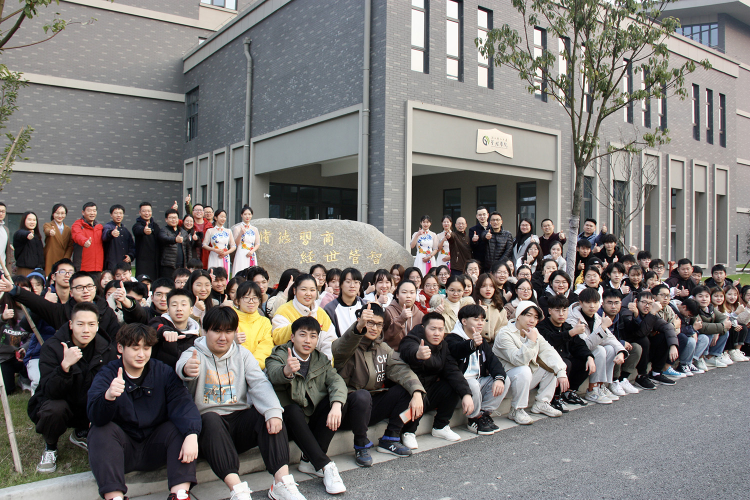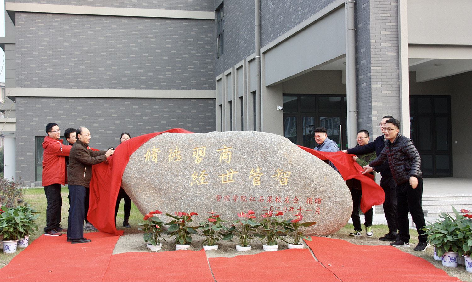 随着王军副书记、吴俊杰副院长和红石梁班校友代表共同拉动红绸,一樽刻有“修德习商,经世管智”的院训石正式伫立在管理学院主楼前。