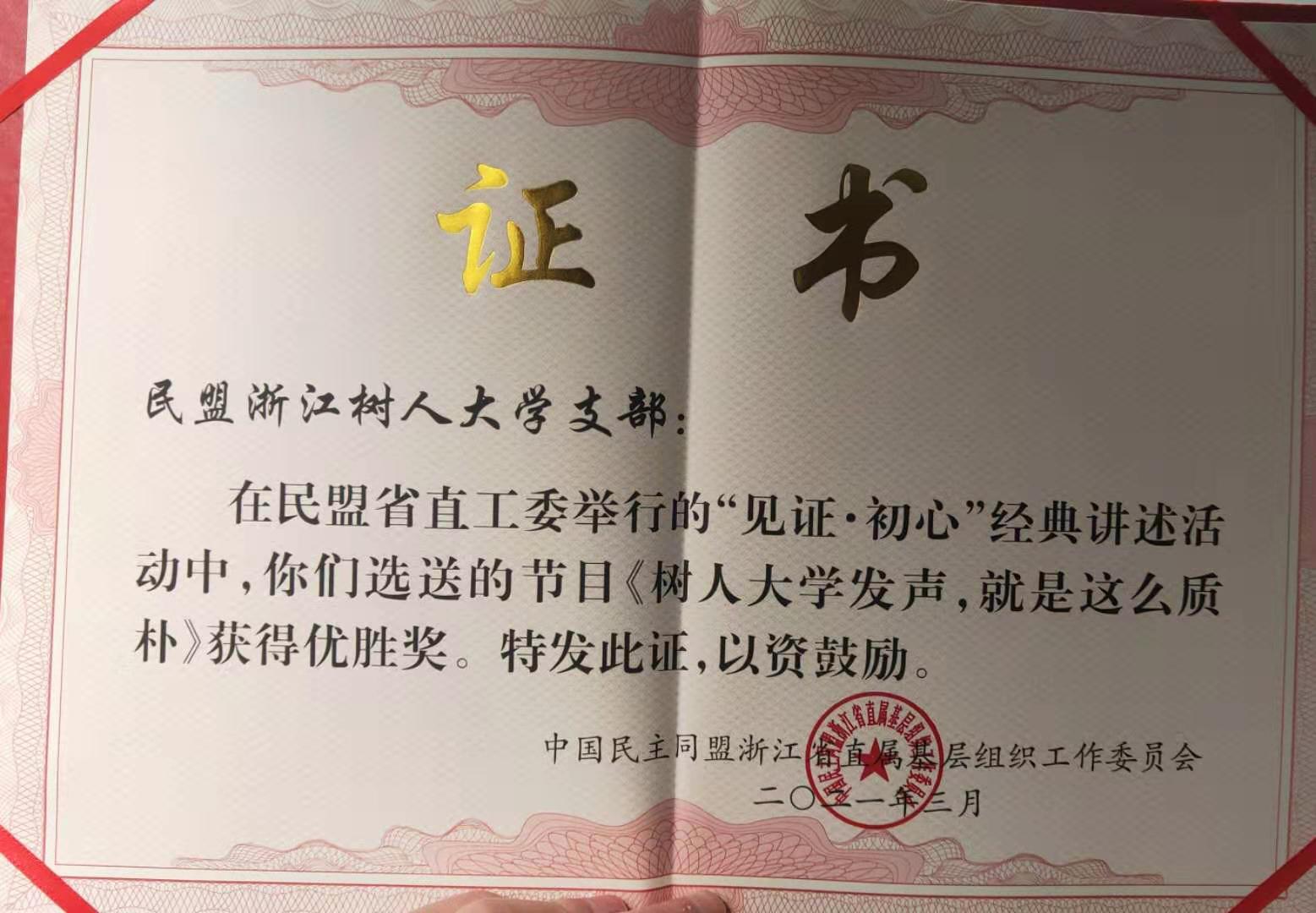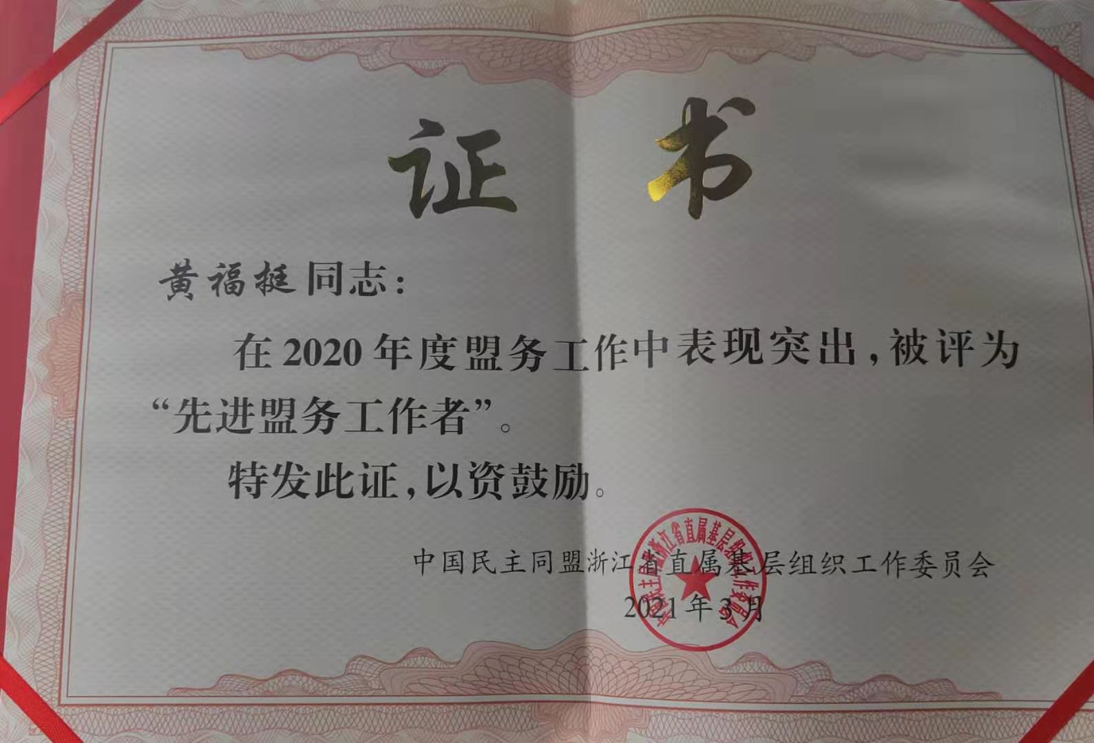 会上,民盟省委会专职副主委徐燕峰,总结了过去一年浙江民盟所取得的成绩,并部署了2021年重点工作任务,同时主席台领导对获得2020年相关荣誉的组织与个人进行了表彰。我校民盟支部喜获“先进基层组织”荣誉称号,黄福挺获“先进盟务工作者”称号,同时支部还获颁民盟省直工委举办的“见证·初心”经典讲述活动优胜奖奖状。