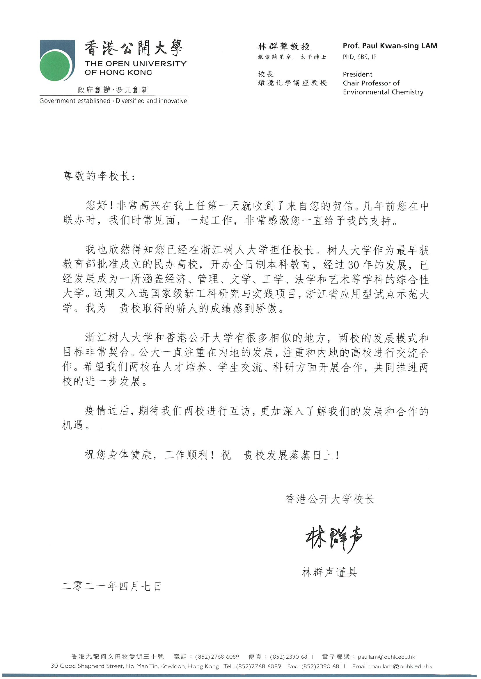 林群声校长复信学校,感念曾经与李校长在香港一起工作的深厚情谊,并对我校建校30多年来取得的骄人成绩表达了由衷的骄傲,同时也希望两校在人才培养、学生交流、科研方面开展合作,共同推进两校的进一步发展,并期待在疫情过后进行两校互访,更加深入了解两校发展和合作的机遇。