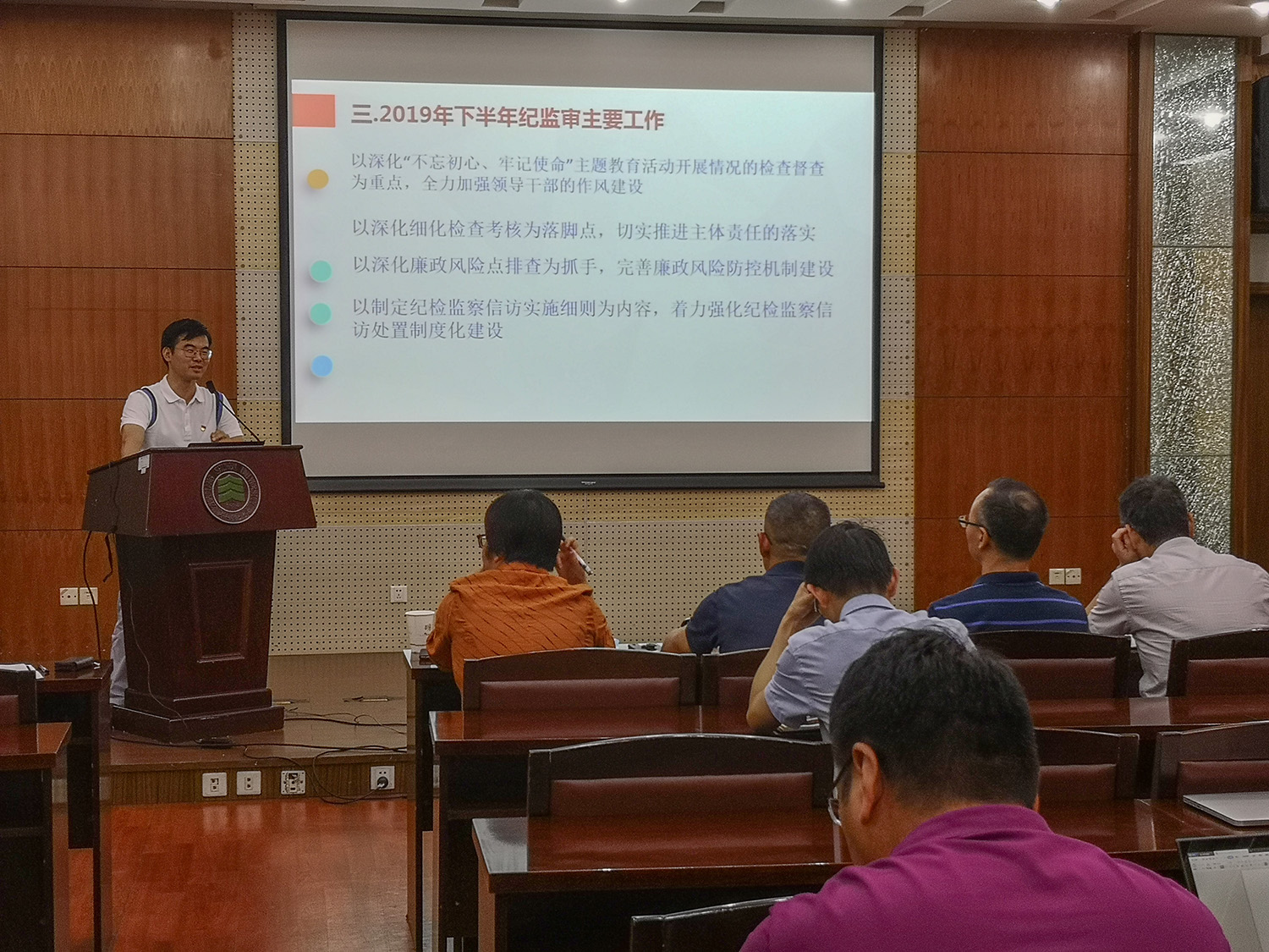 7月4日下午,在行政中心6楼会议室召开了全校纪检工作会议,回顾总结2019年上半年工作,谋划2019年下半年工作思路,开展党风廉政警示教育月活动。校纪委委员、二级党组织纪检委员、教工支部纪检委员、特邀检察员、机关党委第八支部全体成员参加了会议。