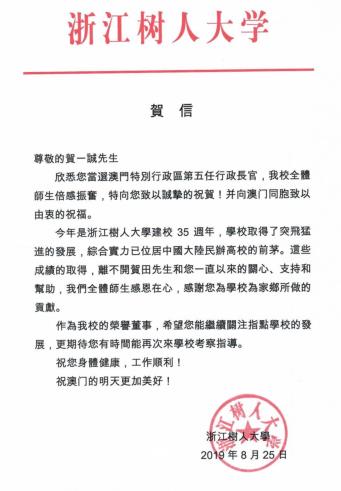 学校获悉贺一诚当选澳门特区第五任行政长官后,第一时间发去贺信致以诚挚的祝贺,向澳门同胞致以由衷的祝福,并对贺一诚及其父亲贺田先生一直以来对学校的关心、支持和帮助表示衷心的感谢!