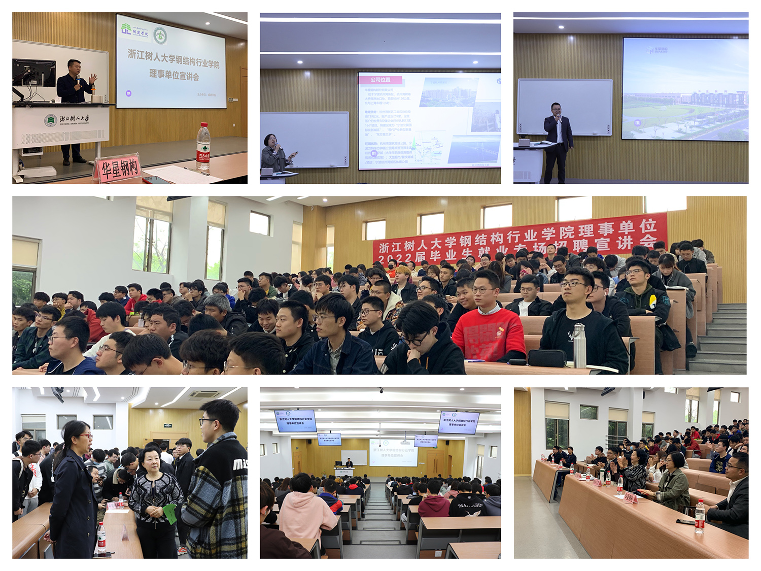 为推进城建学院党史学习教育活动之“我为师生办实事”活动深入开展。4月13日下午,城建学院、浙江省钢结构行业协会、钢结构行业学院理事单位联合举办了第一期钢结构行业学院校园专场招聘宣讲会,共同推进校企人才交流合作,真正履行“三送”服务即“送宣讲”进学校,“送岗位”进学校,“送服务”进学校。值得一提的是,本次宣讲的对象,企业均提前瞄向了2022届毕业生。浙江中南建设集团钢结构有限公司、杭州恒达钢构股份有限公司、浙江盛达铁塔有限公司、华星钢构有限公司这4家企业副总、技术总监、人力资源主管等共11位主讲嘉宾,分别面向200余名学生进行宣讲。浙江省钢结构行业协会代表陆涵女士、18级年级辅导员出席。宣讲会由学院党委副书记翁就勇主持。